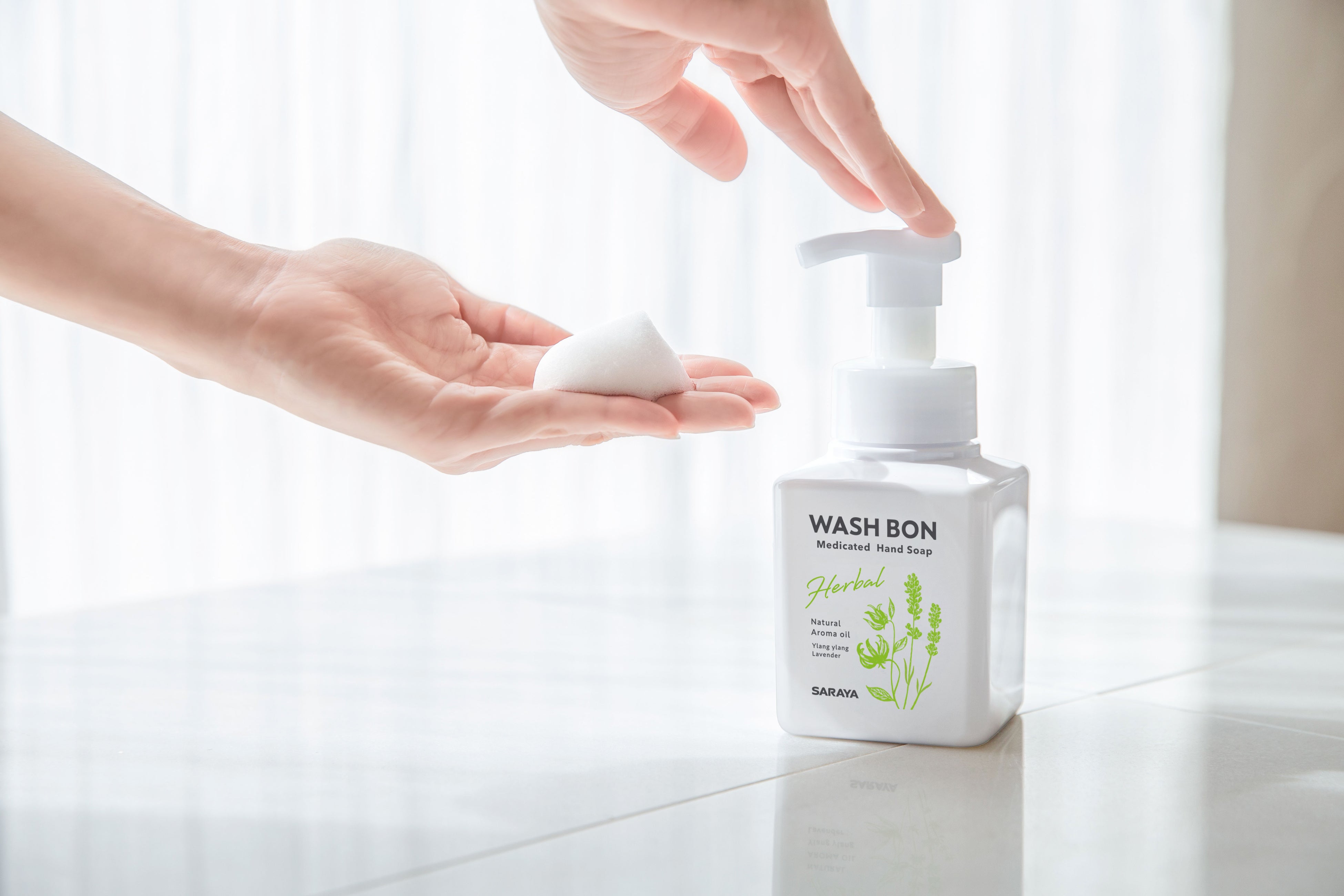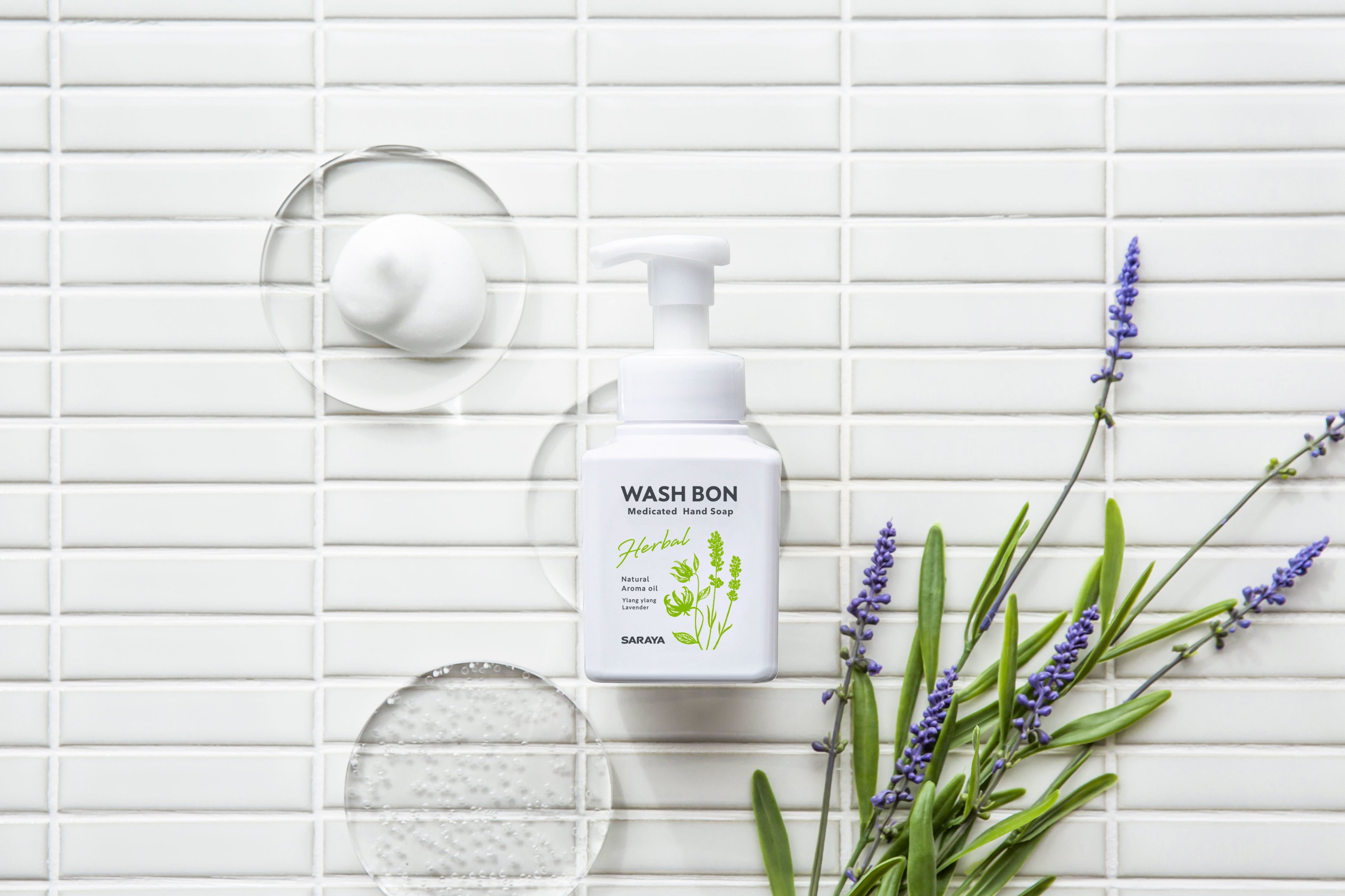 「ウォシュボン ハーバル薬用ハンドソープ」は、やさしい洗い心地にこだわった植物性うるおい成分配合の薬用泡ハンドソープです。天然精油100%の香りとふんわり泡に包まれて、いつもの手洗いを“心もひと息つけるような“ちょっと良いひとときに演出します。