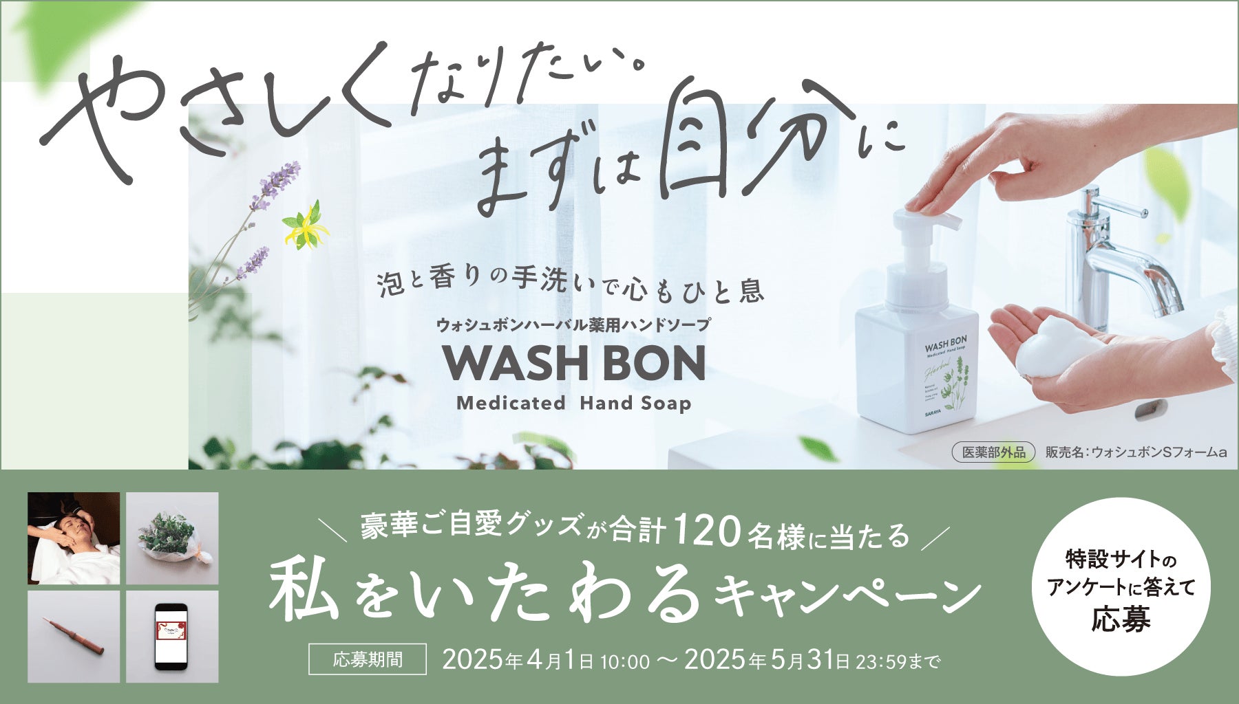 今回「ウォシュボン」は、新たな環境や新生活で疲れがちなこの時季、「やさしくなりたい。まずは自分に」をキーメッセージに、豪華グッズが合計120名様に当たる「私をいたわるキャンペーン」を実施いたします。