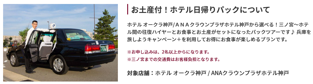 ホテル オークラ神戸/ANAクラウンプラザホテル神戸から選べる!三ノ宮~ホテル間の往復ハイヤーとお食事とお土産がセットになったパックツアーです♪ 兵庫を旅しようキャンペーン+を利用してお得にお食事が楽しめるプランです。