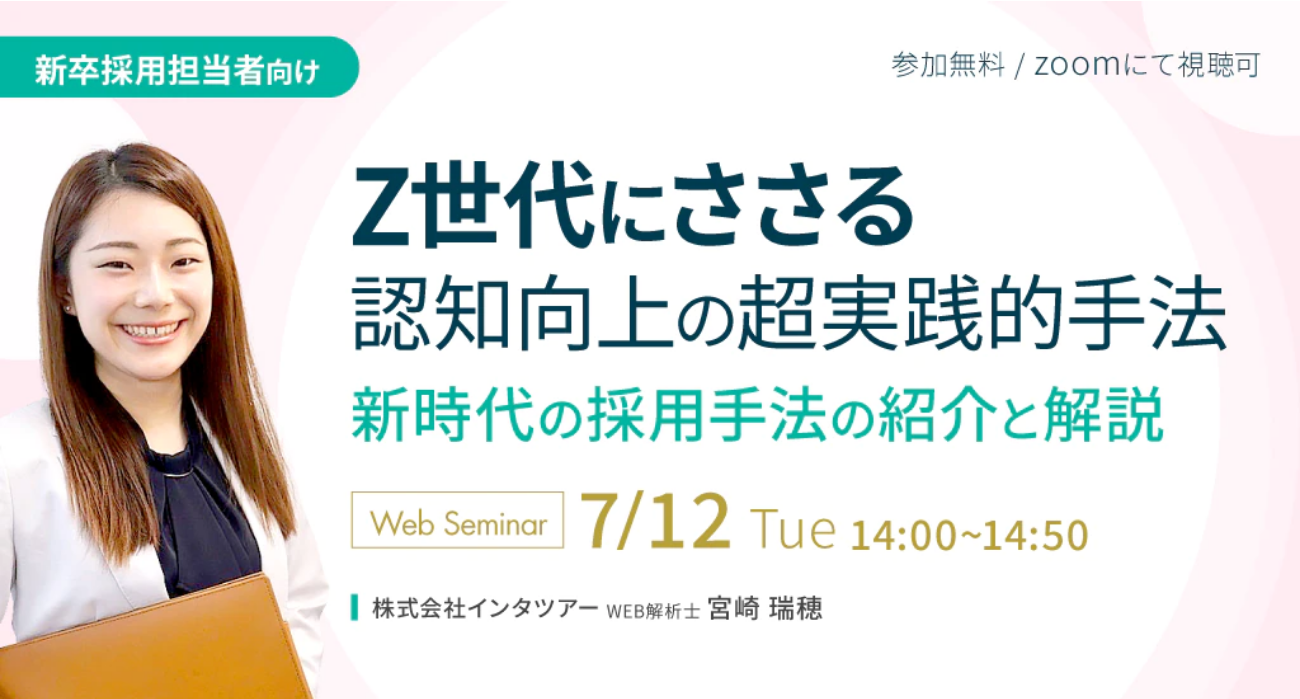 新卒採用マーケティング・プラットフォームを提供する(株)インタツアー(代表:作馬 誠大、本社:東京都港区浜松町)は、2022年7月12日(火)に、新卒採用担当者向けオンラインセミナー『Z世代にささる認知向上の超実践的手法~新時代の採用手法の紹介と解説~インタツアー使い方セミナー』を開催いたします。