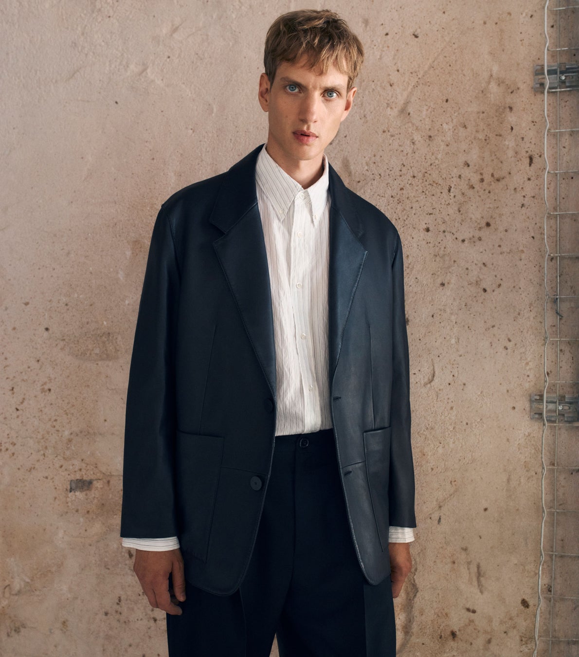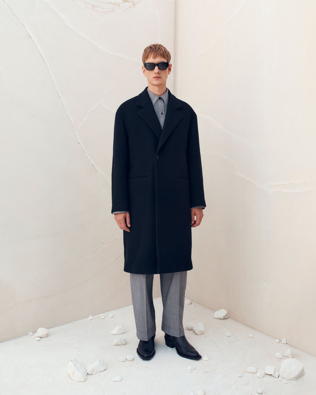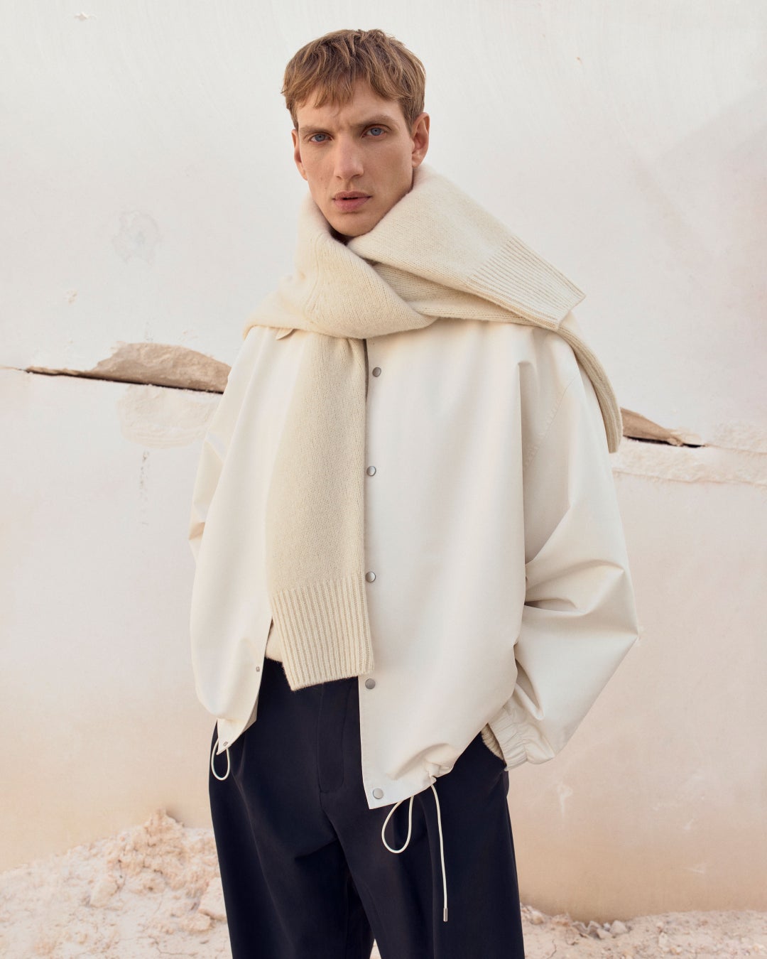 RWSウール77%とナイロン23%のウール・コートが冬のアイテムを引き立て、スポーティで都会的なモードに伝統的な魅力を添えています。ニック・ウェイクマンがネクタイを再導入し、ノスタルジックなメンズウェアの「仕上げのタッチ」を最前面に復活させました。柔らかく構成され、体にフィットするようにカットされたこのカプセ ル・コレクションは、着用者に解放感と自律性の感覚を与えるために作られた実用的な服です。