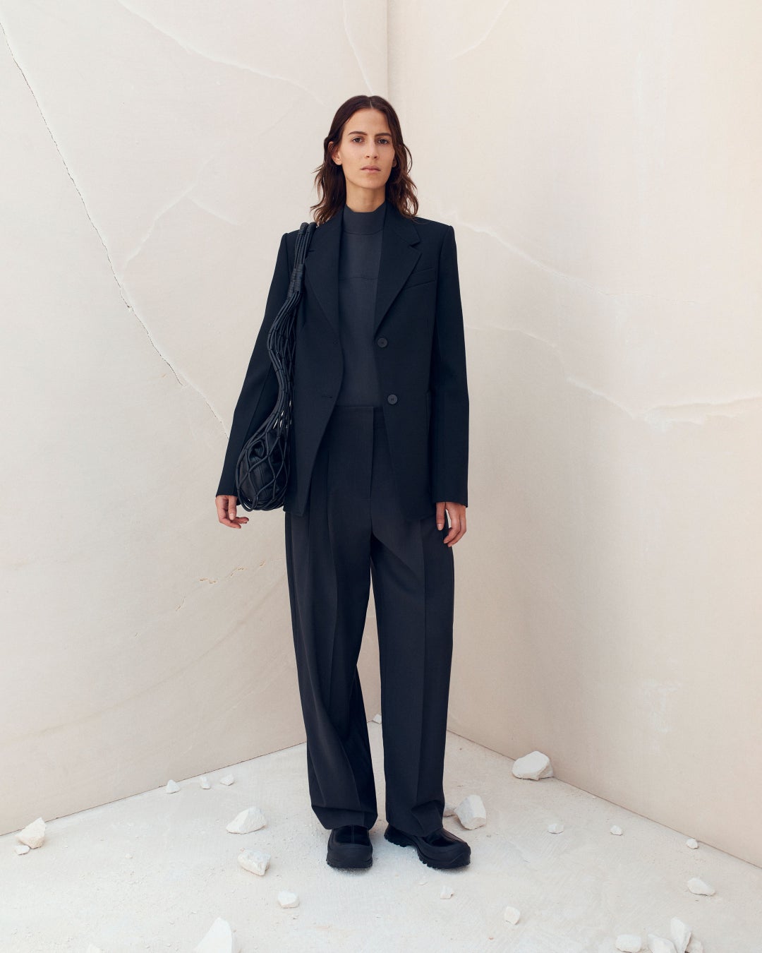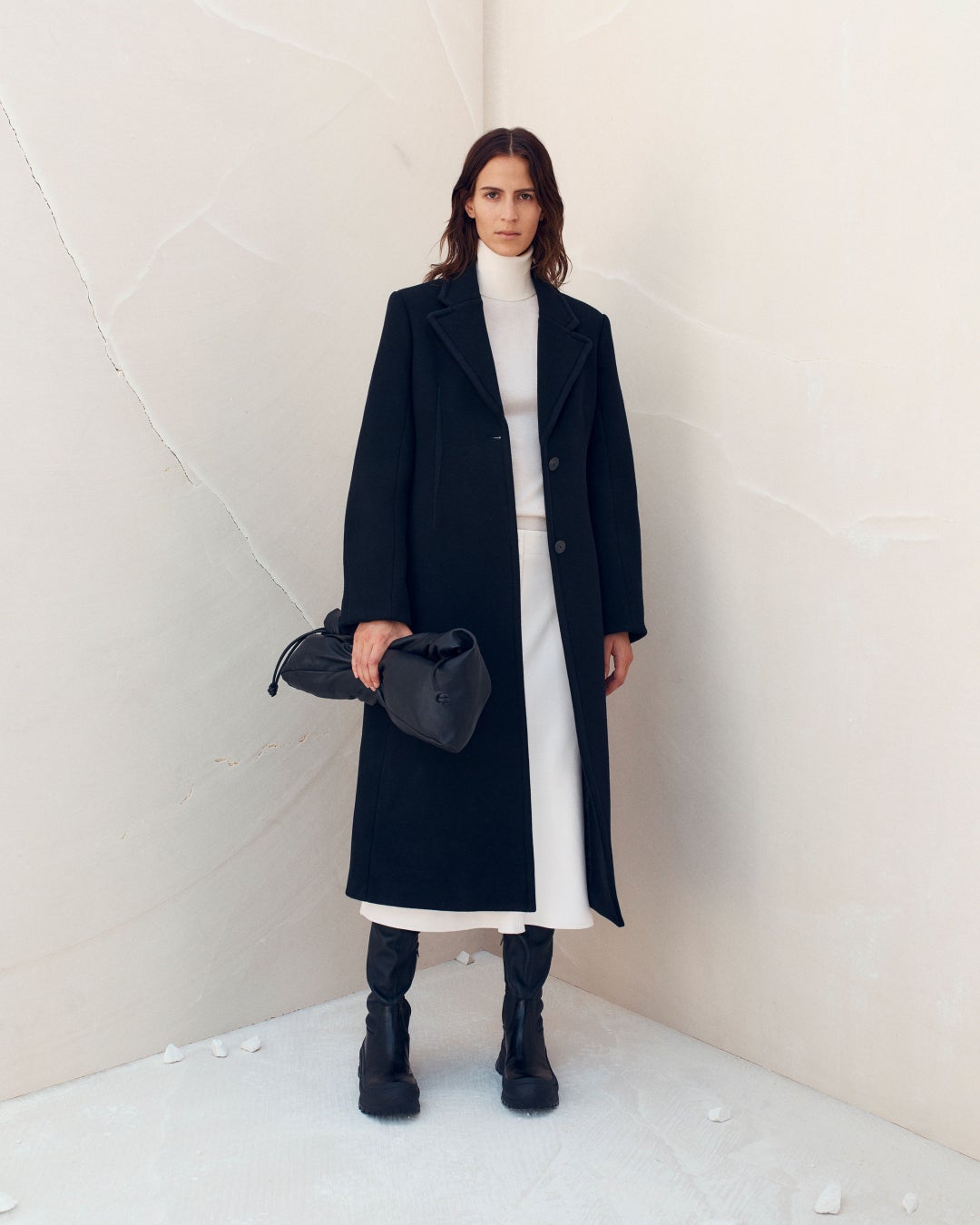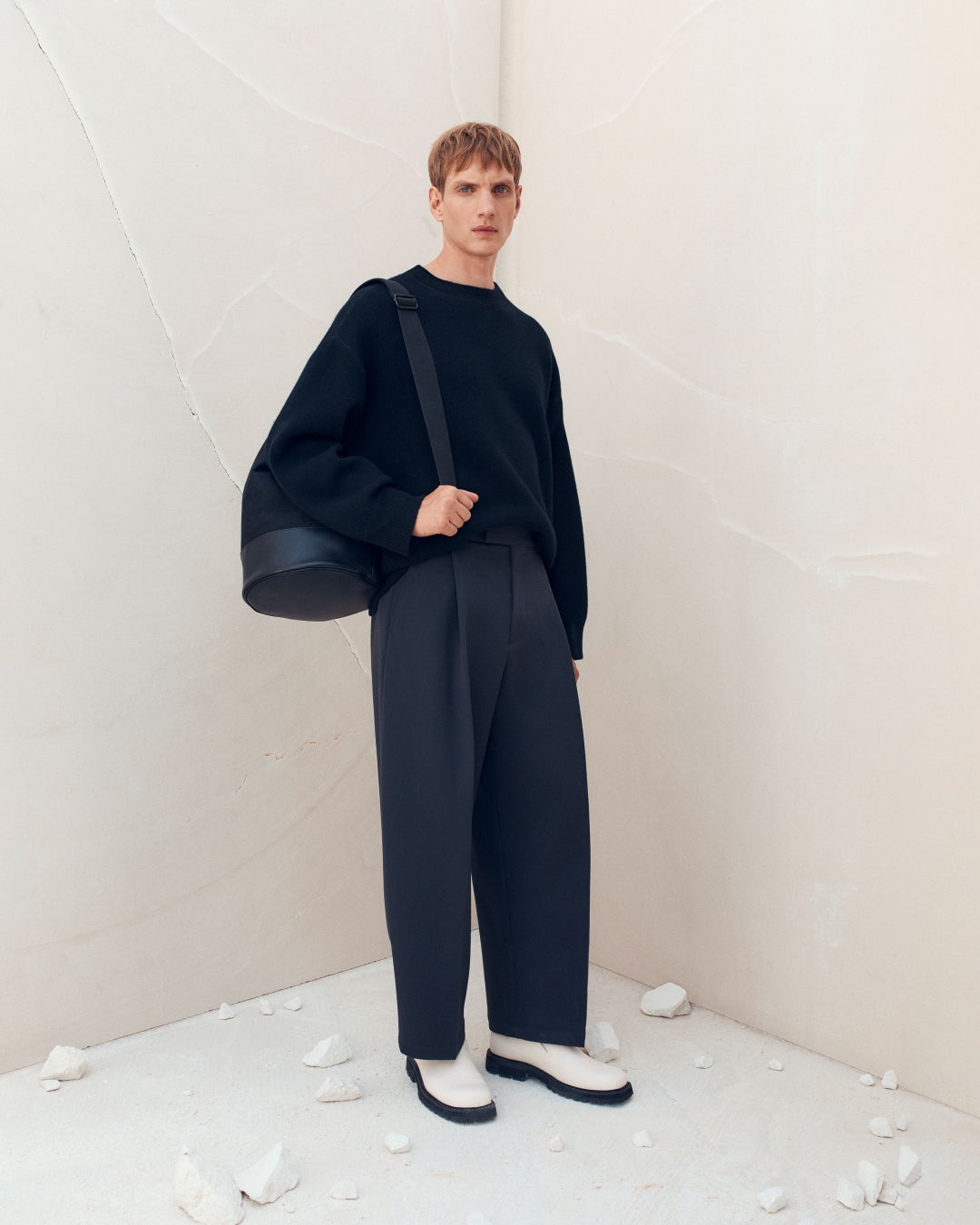 RWS(Responsible Wool Standard:責任あるウール規格)認証のウールを使用したシングルプリーツのボリュームパンツ、オーガニックコットン素材のベルテッドドレスやボックスフレッシュなデニムパンツ、リサイクルカシミア混紡のコクーンニットなど、これらは実績のあるファブリックです。フットウェアとアクセサリーは、入念に選定されたレザーによって制作されたことによって、触覚的なスタンスを服だけにとどまらず、アクセサリーにも反映したカプセル・ワードローブに仕上げるために意図的に取り入れたものです。ニック・ウェイクマンは、ルック全体に互換性を持たせています。またこのコレクションは長く愛用出来るように構築されています。