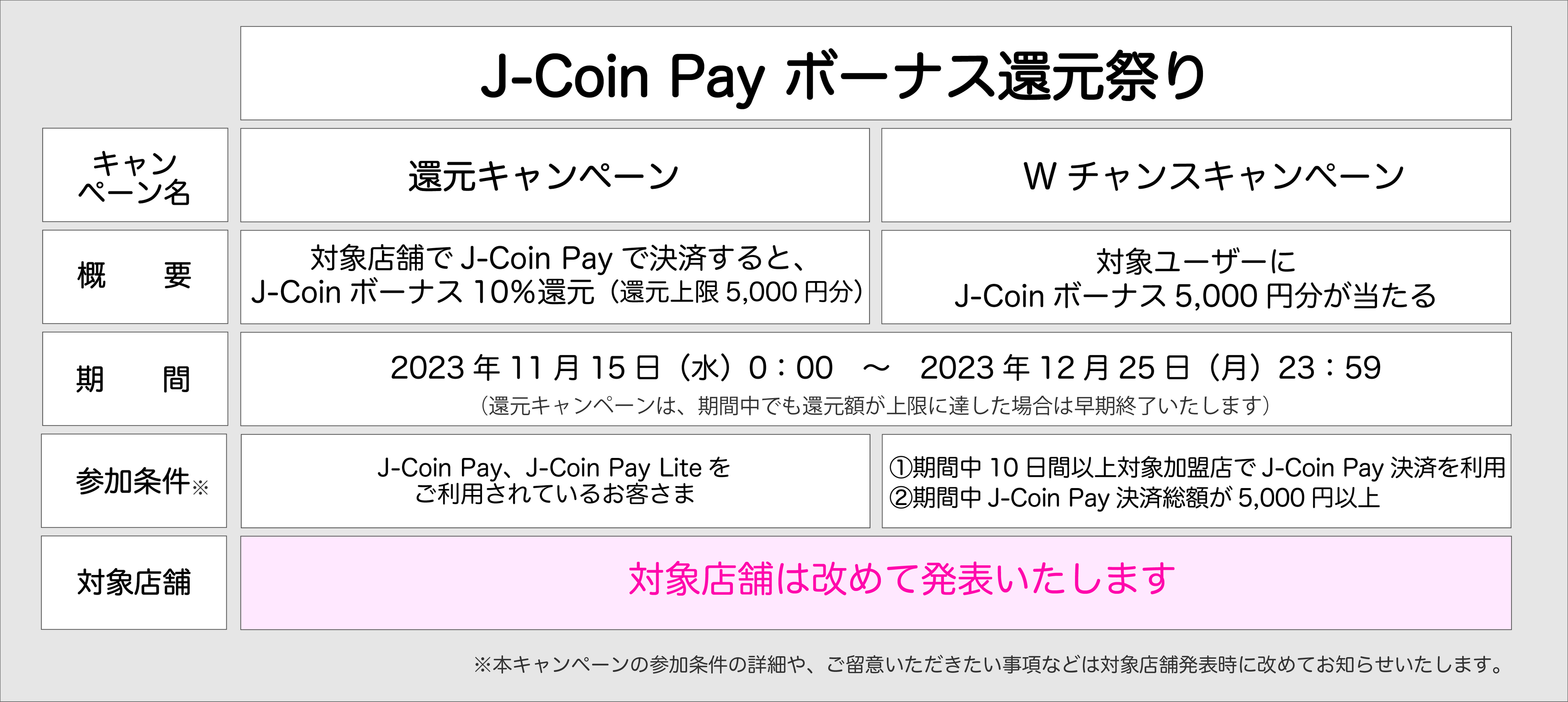 株式会社みずほ銀行が提供するキャッシュレス決済サービスJ-Coin Payは、2023年11月15日より、毎日のお買物などでご利用いただける加盟店を対象に「J-Coin Pay ボーナス還元祭り」を開催します。