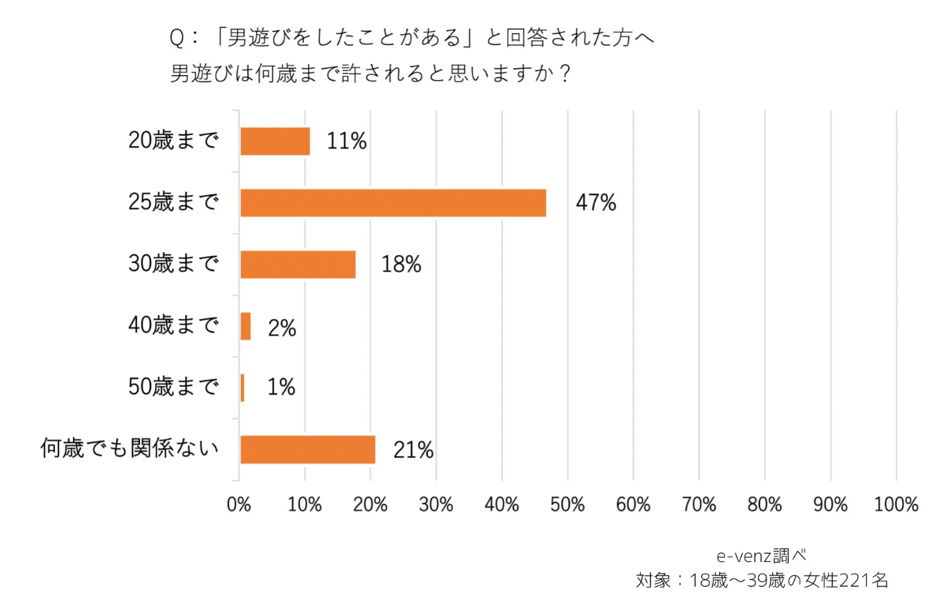 男遊びをしたことがある18歳から39歳の女性221名に、男遊びは何歳まで許されるのかを調査してみました。