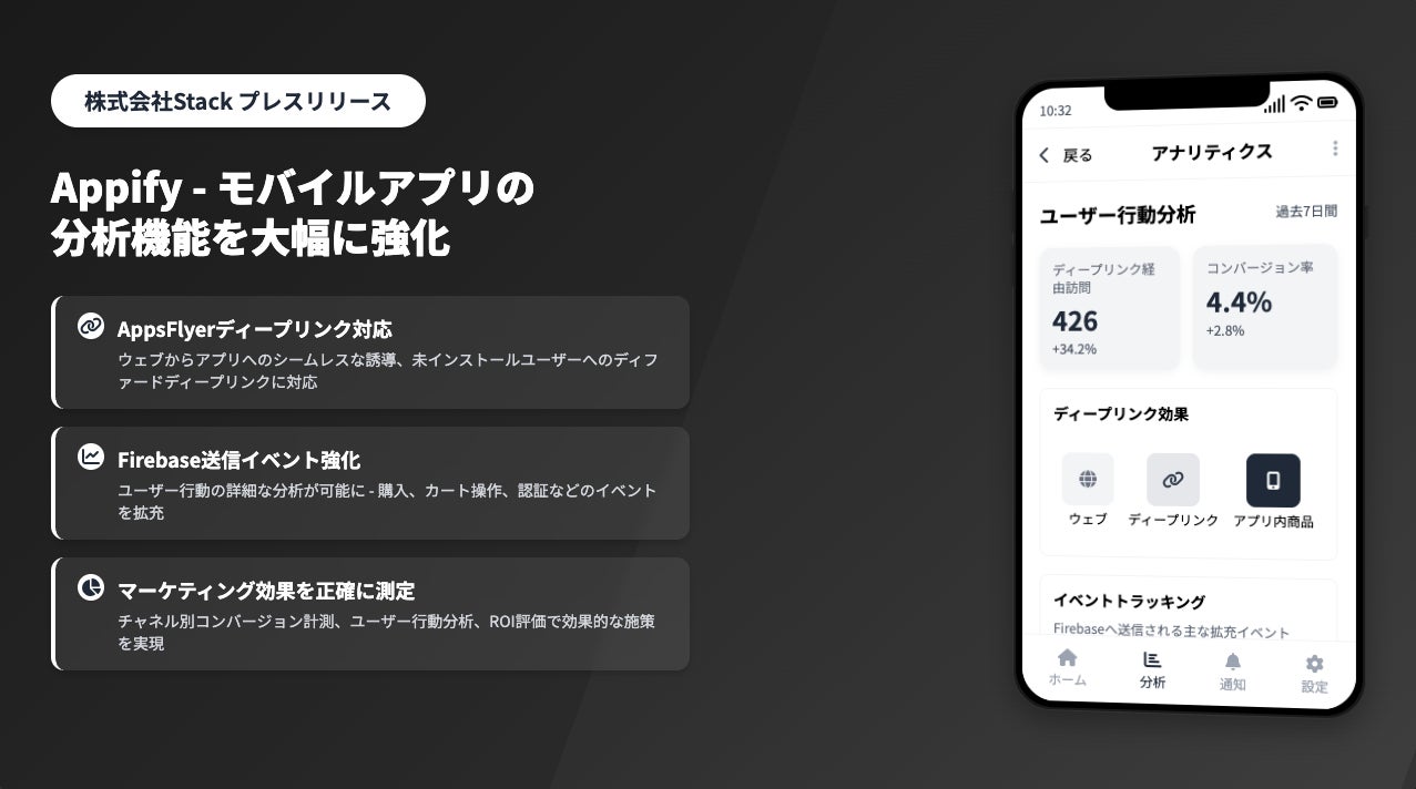 株式会社Stack(本社:東京都渋谷区、代表取締役CEO:福田涼介、以下「Stack」)は、Shopifyストア向けモバイルアプリ構築サービス「Appify - モバイルアプリ」の分析機能を大幅に強化しました。今回の強化では、AppsFlyerが提供するディープリンクへの対応と、Firebaseへ送信するイベントの拡充を行いました。これにより、Appifyを利用するマーチャントは、より高度なユーザー行動分析とマーケティング施策の効果測定が可能になります。