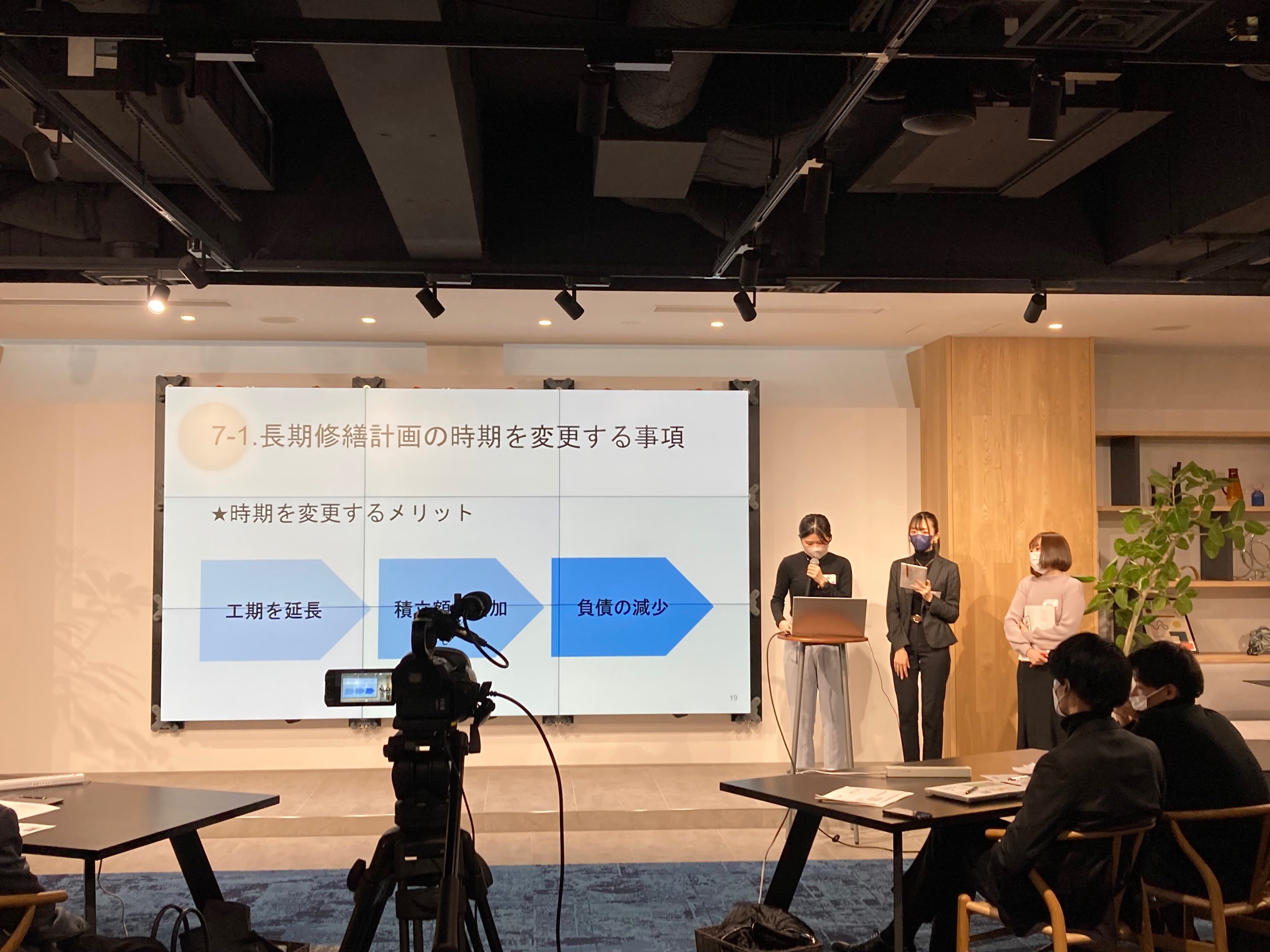 当社が所有する実際のマンションデータに基づいた条件設定のもと、「築30年のマンションの管理改善計画」をテーマとした演習プログラムを、明海大学の小杉学准教授・藤木亮介准教授らと共同で企画。全16回行われた授業の最終回では、総会の場で区分所有者に対し管理改善計画の提案を行うことを想定したプレゼンテーション発表会を、当社の情報発信プラットフォーム「赤坂プラスタ」で行いました。マンションみらい価値研究所所長 久保依子をはじめ、同研究所のメンバー、そして当社役員などが直接フィードバックを行い、マンション管理業界のリアルな課題感を学生に伝えることができました。