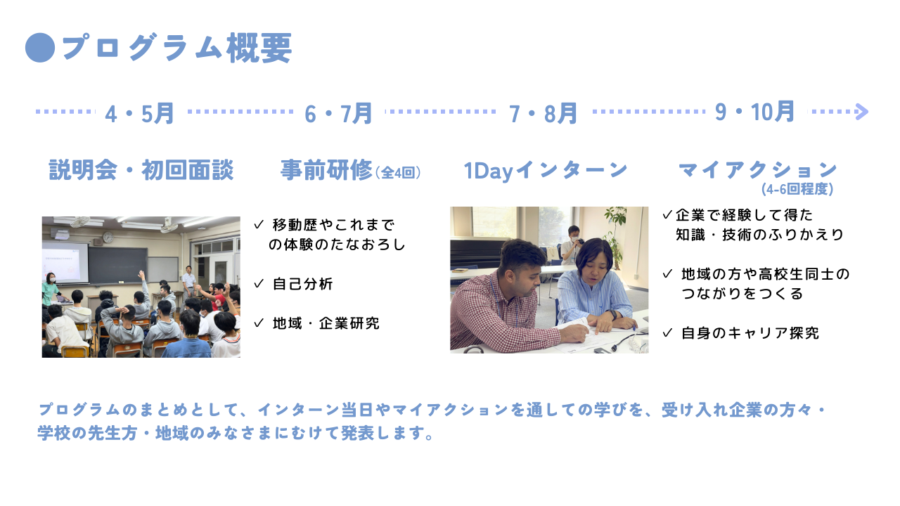 Rootsインターンは、企業に赴いての1Day体験を軸に、約半年間のメンタリングと高校生自身が設定したキャリア実現への1歩「マイアクション」を考えられるようなプログラムで構成されています。