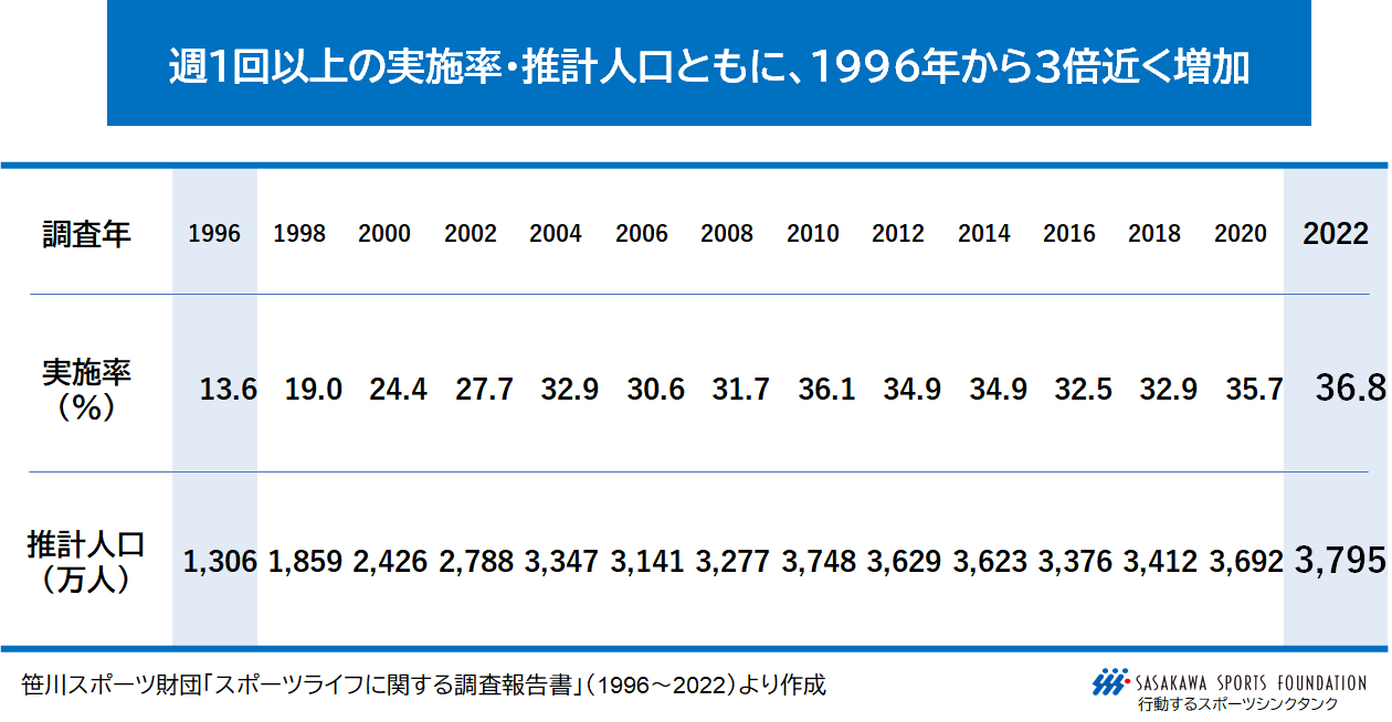 20歳以上の週1回以上の実施率は36.8%、推計人口は3,795万人であった。1996年には実施率13.6%、推計人口1,306万人であったが、年1回以上の実施率・推計人口と同様の推移を示し、調査開始以来最高の数値となった。この26年間で実施率と推計人口が3倍近く増加し、2020年から実施率は1.1ポイント上昇、推計人口は103万人増えた。また、2004年からは約3人に1人が定期的に散歩・ウォーキングを実施している。