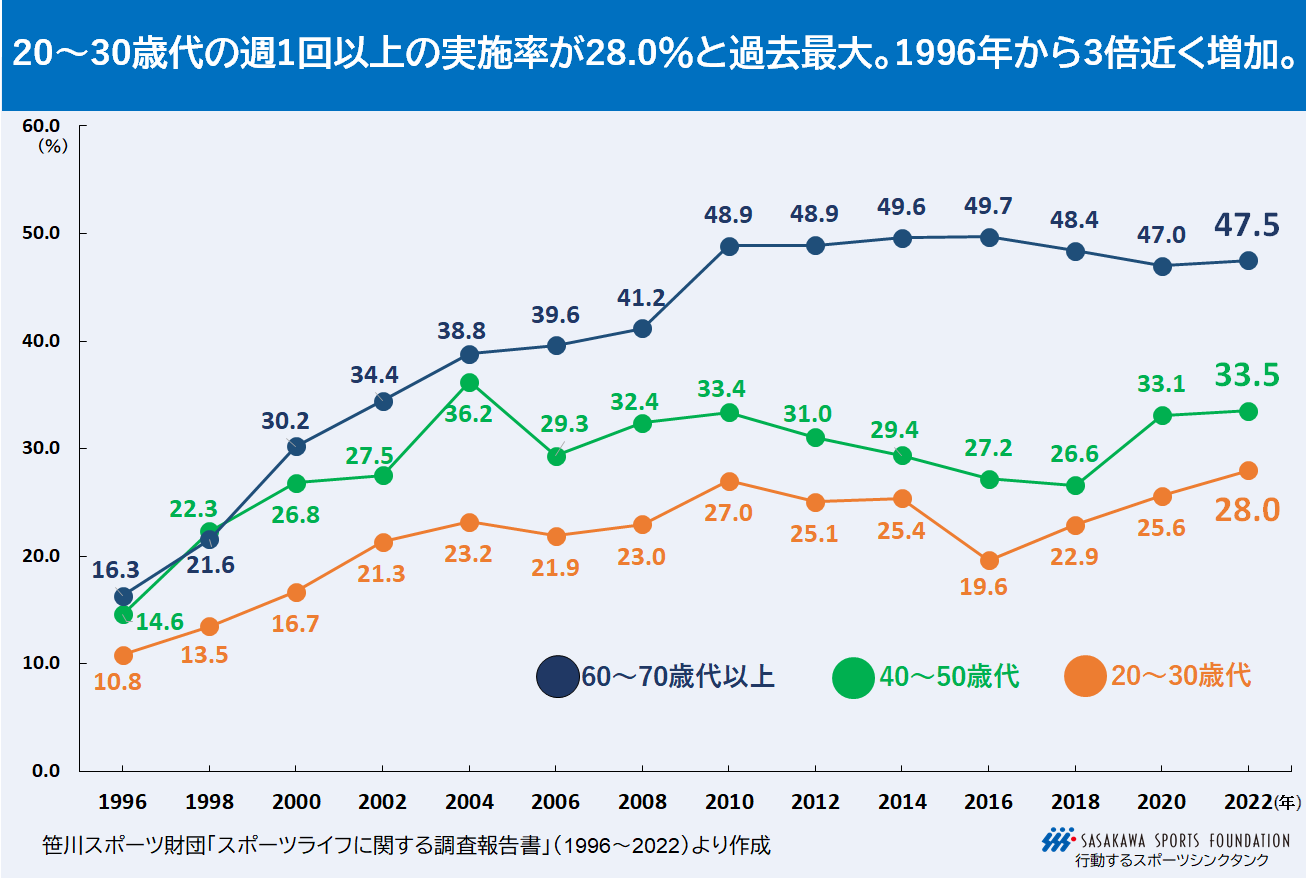 ■20~30歳代の週1回以上の実施率が28.0%と過去最大に。1996年の10.8%から3倍近く増加。