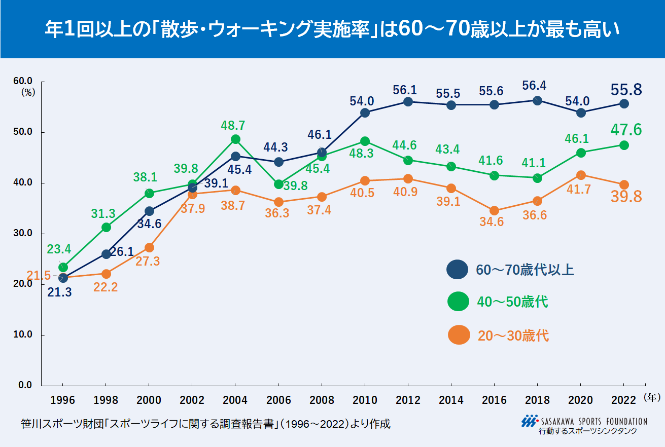 年代別による年1回以上の散歩・ウォーキング実施率は、60~70歳以上55.8%、40~50歳代47.6%、20~30歳代39.8%の順に高く、若い年代ほど実施率が低い傾向にある。実施率の推移をみると、60~70歳以上は2012年56.1%まで増加を続けその後は横ばいで推移している。40~50歳代と20~30歳代は2010年前後まで漸増したのちに一旦ゆるやかな減少傾向となり、近年再び増加に転じている。