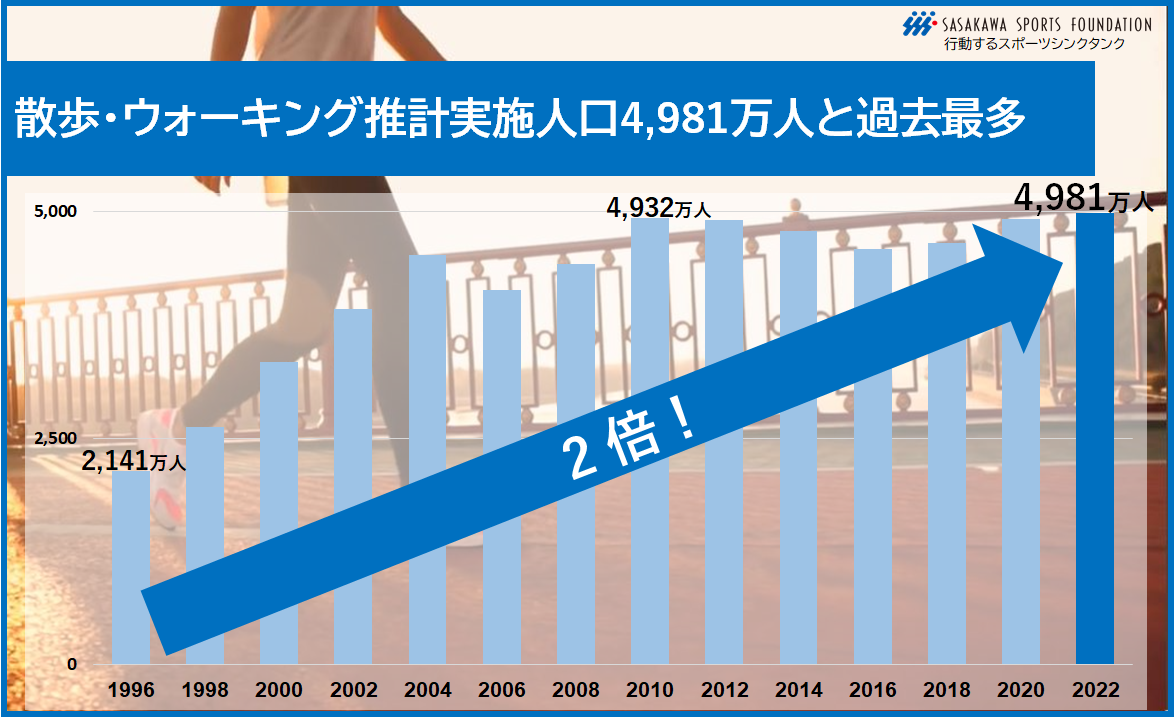 散歩・ウォーキング推計実施人口4,981万人。1996年の調査以来過去最多。