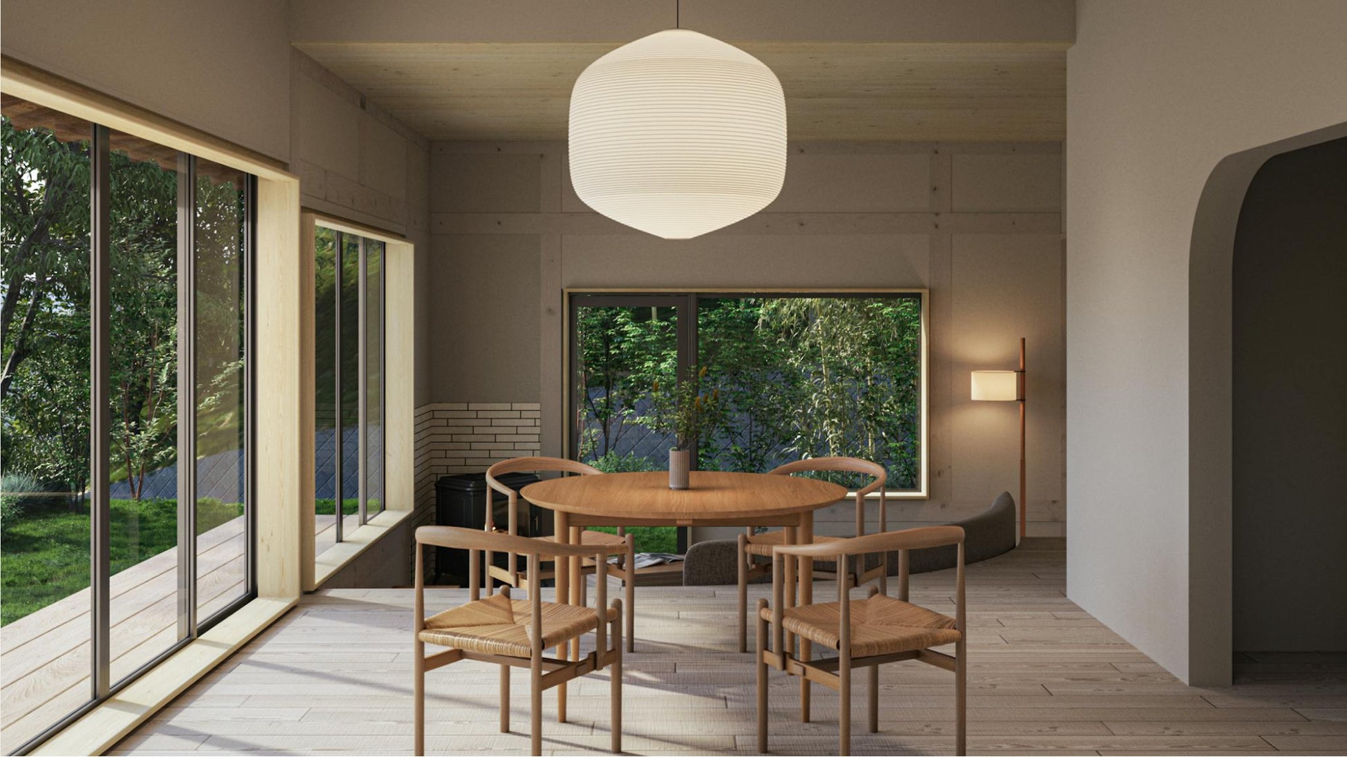 のどかな田園風景が広がる足柄。丘の上に立つ木調の建物となっており、高台から見える山と麓の街並みが訪れた人を癒すセカンドホームです。既存の窓に新たに額縁を付けることで、この足柄の美しい眺めをまるで絵画のように切り取るデザインとなっており、地域の美しい自然風景と一体化する時間を提供します。