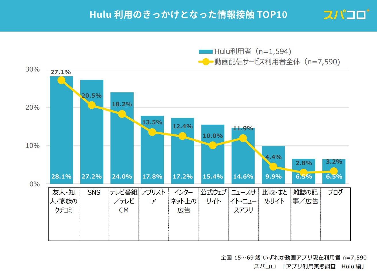 Huluを利用するきっかけとなった情報接触では「友人・知人・家族のクチコミ」(28.1%)、「SNS」(27.2%)、「テレビ番組/テレビCM」(24.0%)が上位に並ぶ結果となりました。