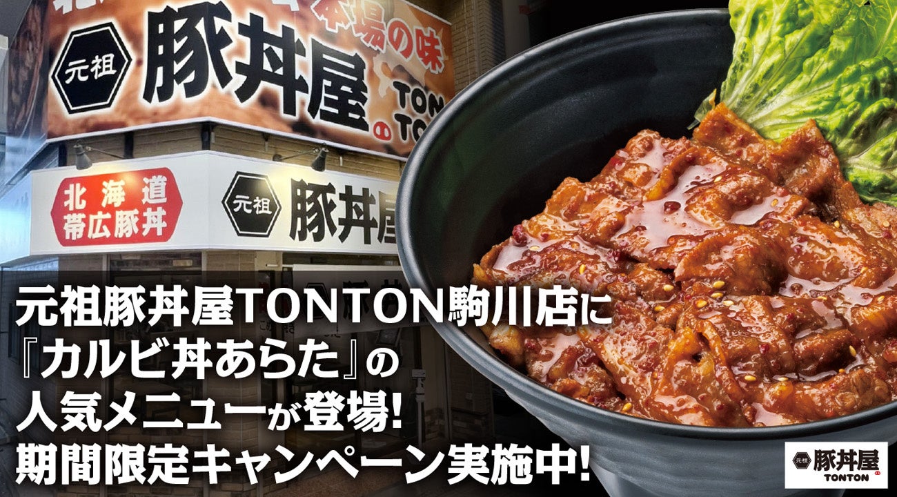 北海道・帯広豚丼が人気の「元祖豚丼屋TONTON 駒川店」(住所:大阪府大阪市東住吉区駒川4-11-24、TEL:06-6657-7973)に新メニューが登場!11月12日(土)〜26日(土)に限り「カルビ丼【並】」を期間限定価格580円(税込)で提供いたします。