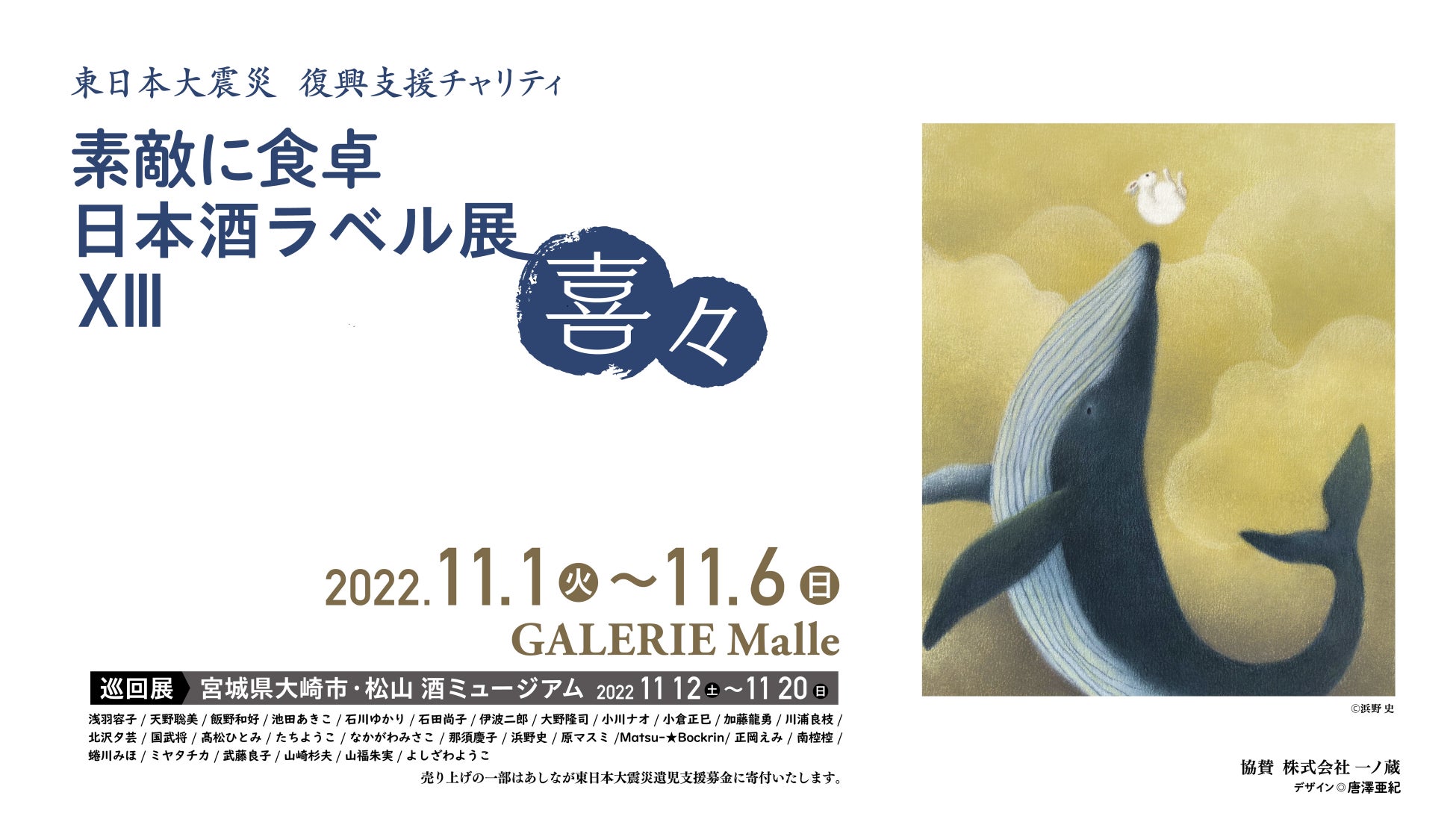 東京都渋谷区恵比寿のGALERIE Malle (ギャラリー まぁる)は、東日本大震災 復興支援 チャリティ「素敵に食卓‐日本酒ラベル展XⅢ 喜々」を(株)一ノ蔵協賛で2022年11月1日(火)より本展と巡回展(11月12日~)で開催する。