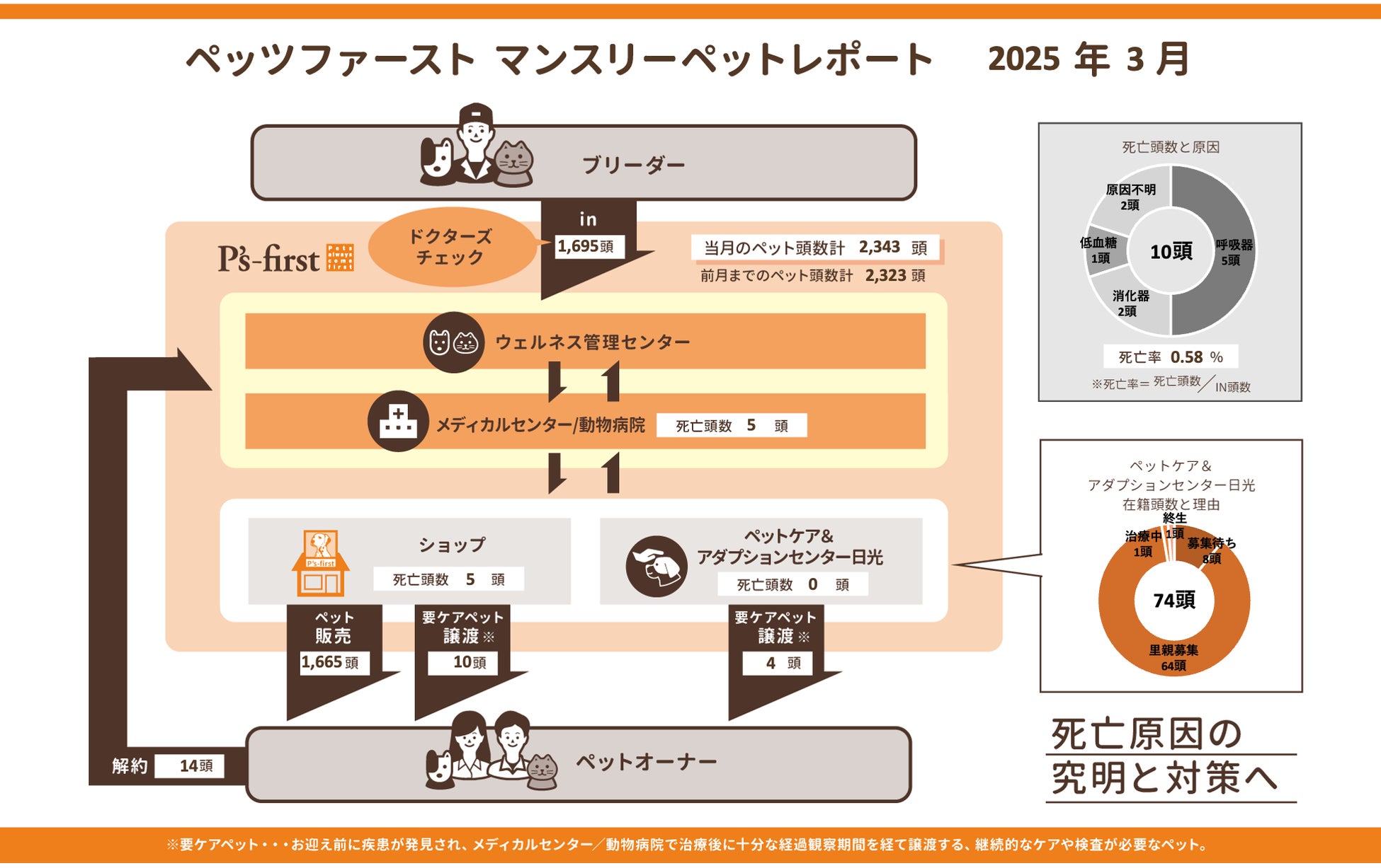 病気や疾患などが発見され、当社メディカルセンターやペッツファースト動物病院内等で治療を施したものの、残念ながら発生した死亡事故数は5頭、店舗においての死亡事故数は5頭、ペットケア&アダプションセンター⽇光内での死亡事故数は0頭でした。
