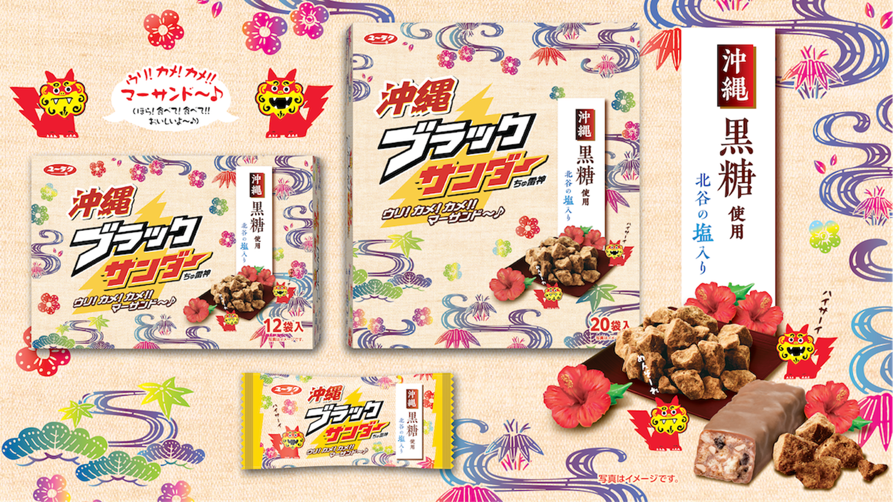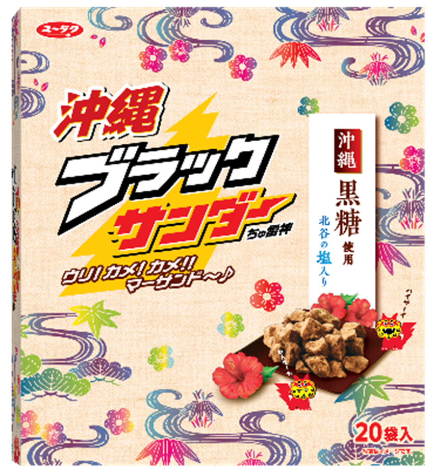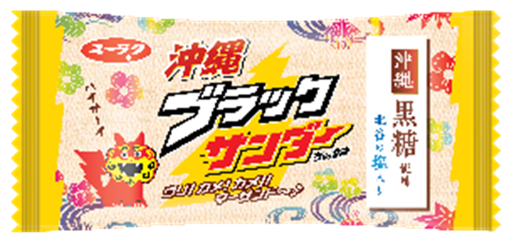 - 沖縄県特産「沖縄黒糖」と「北谷の塩」を使用したブラックサンダー!パッケージは沖縄伝統の染物技法「紅型」をイメージしたデザインに