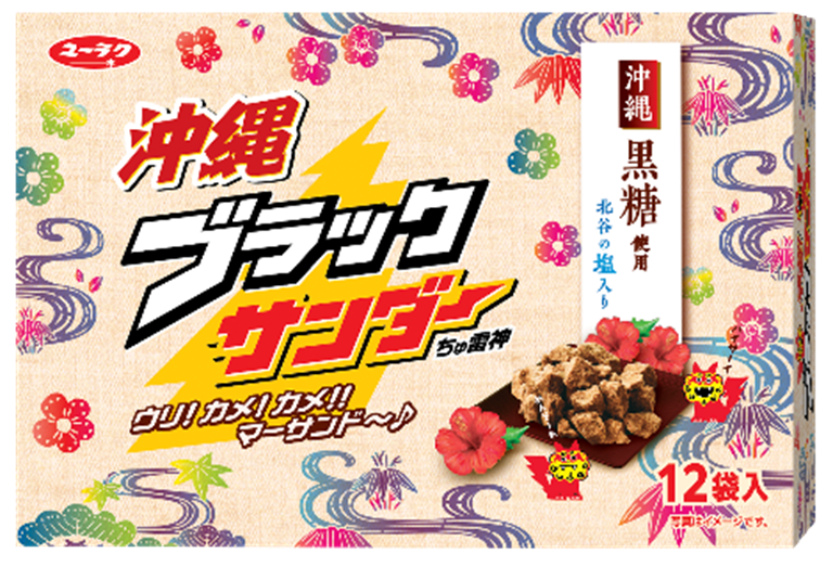 「沖縄ブラックサンダー」は、沖縄の土産商品として2020年5月より販売開始し、沖縄県特産の『黒糖』と『北谷の塩』を使用した味わい深いおいしさと、沖縄を感じられる可愛いパッケージが人気の商品です。