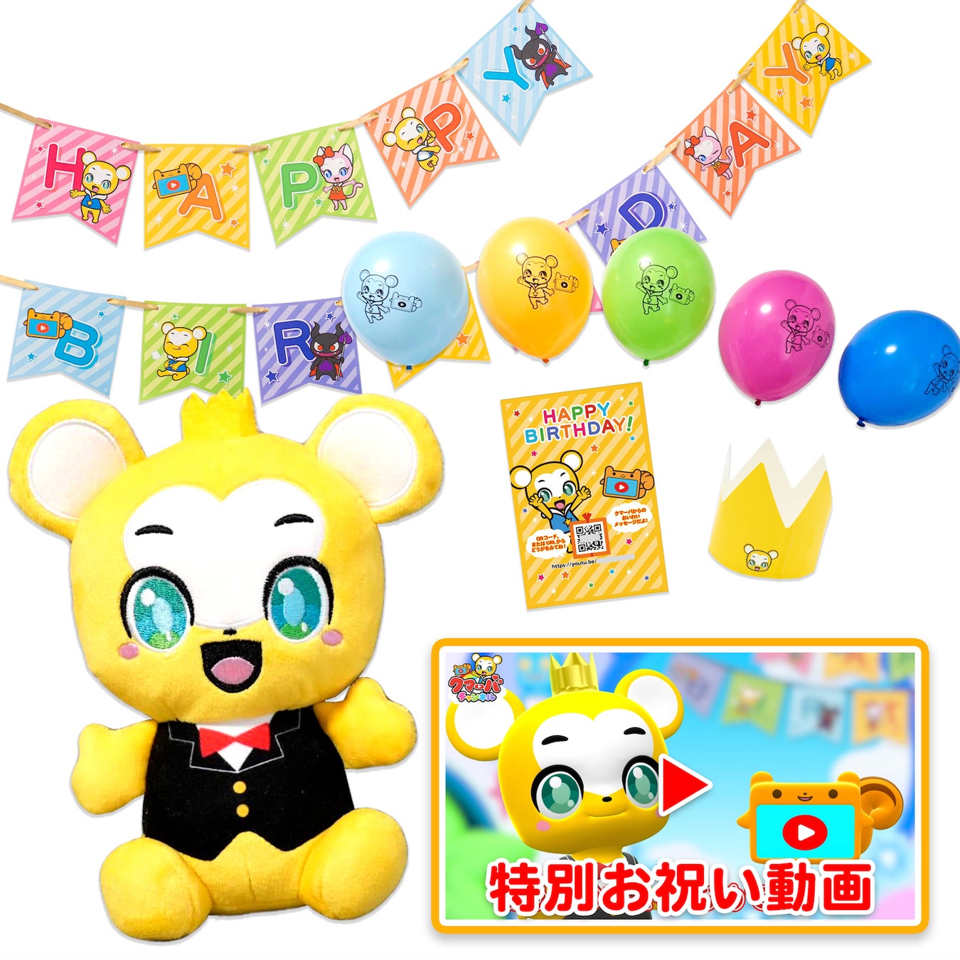 セットの内容:タキシードクマーバぬいぐるみ、ギフトカード(特別動画視聴用QRコード付き)、ガーランド、王冠(クマーバのぬいぐるみとお揃い)、バルーン
