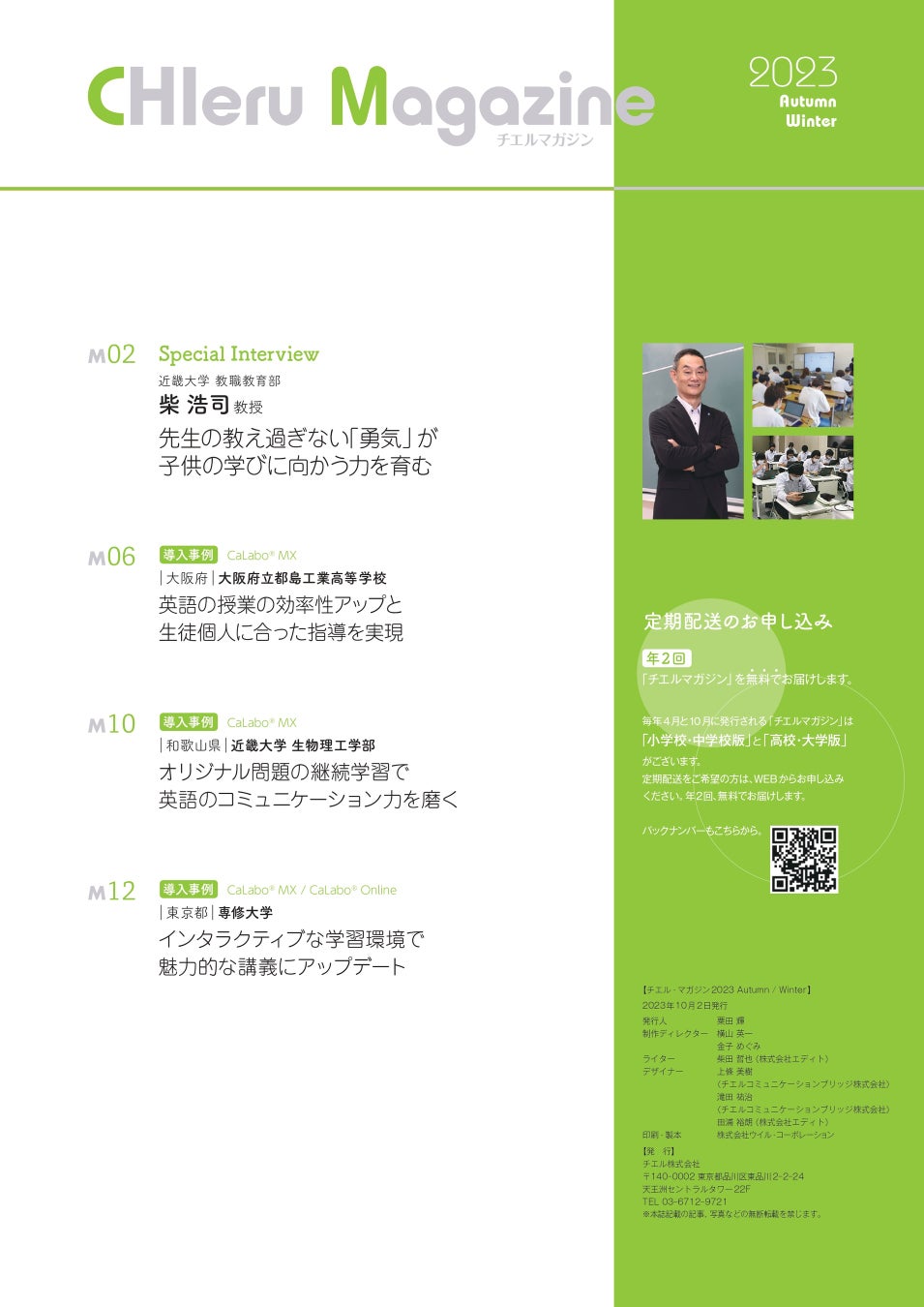 学校教育向けのICT利活用を支援する、チエル株式会社(本社:東京都品川区、代表取締役社長:粟田 輝)は、2023年10月2日(月)より“学校教育現場のICT活性化マガジン"としてご好評いただいている『CHIeru Magazine(チエルマガジン)』2023秋冬号の配布を開始いたしました。これまで同様、全国の教員や学校関係者を対象に無料で配布いたします。併せて、誌面にご登場いただいた先生方を招き、掲載事例をさらに深掘りするオンラインセミナー「チエルマガジンセミナー2023秋冬」を開催いたします。