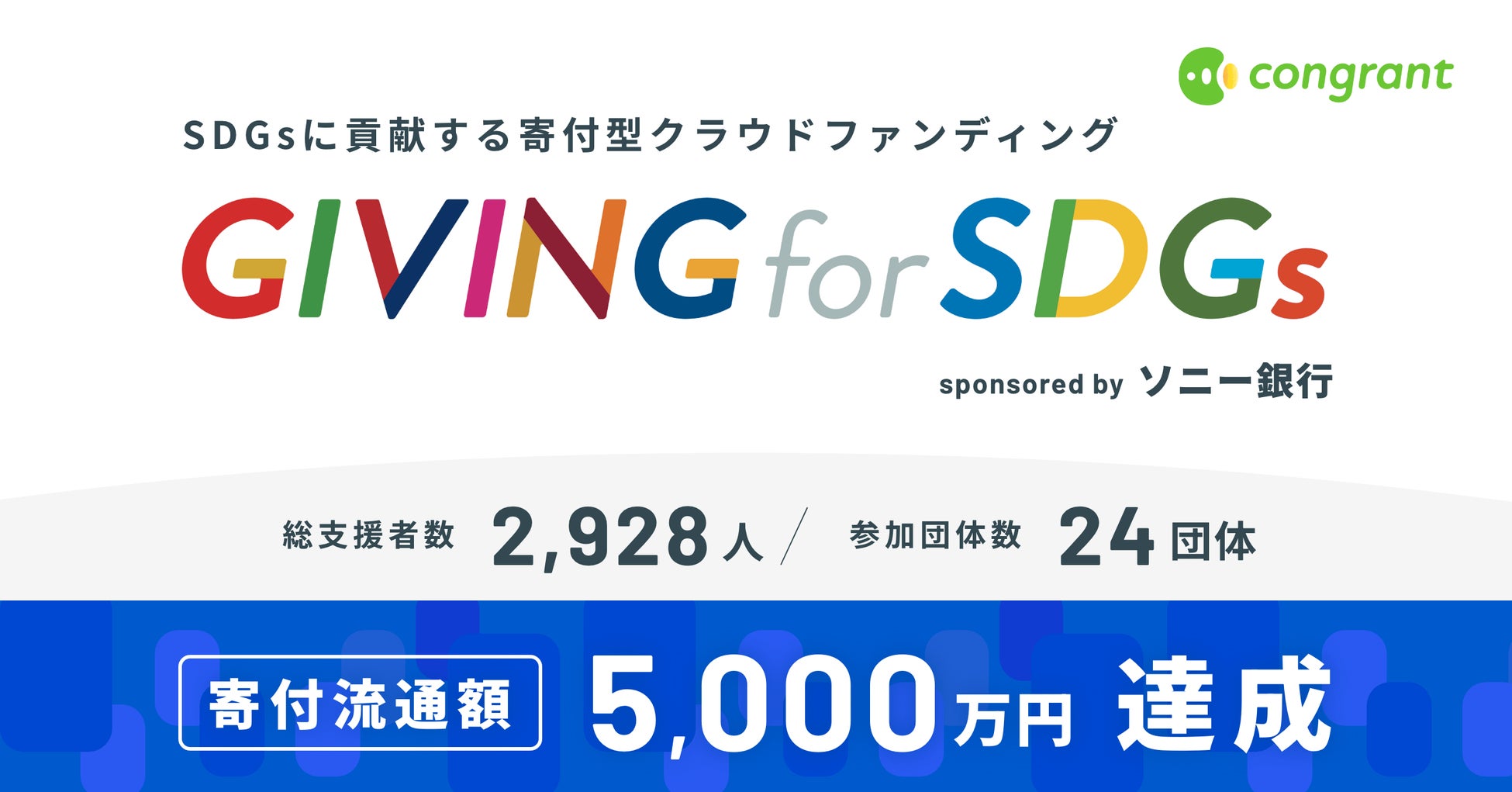 ソーシャルセクターと企業向けに「寄付DXシステム」を提供するコングラント株式会社(本社:大阪市西区、代表取締役:佐藤正隆、以下「コングラント」)は、ソニー銀行株式会社(代表取締役社長:南 啓二/本社:東京都千代田区)の協賛で運営するSDGsを推進するNPOのクラウドファンディングを支援するプログラム「GIVING for SDGs」にて、寄付流通額5,000万円を突破したことをお知らせします。