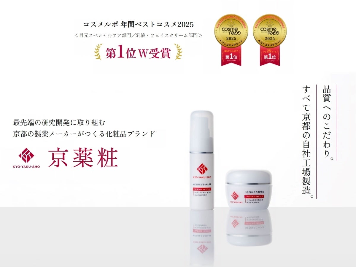 「京都から世界へ、革新的なスキンケア技術を届けたい」という想いをブランド名に込めた『京薬粧』は、日本国内ではバラエティストア、ドラッグストアなどの店舗で展開。2025年12月には美容口コミメディア「コスメルポ」にて『京薬粧』がユーザーから高く評価され「年間ベストコスメ2025」※3に選出されています。