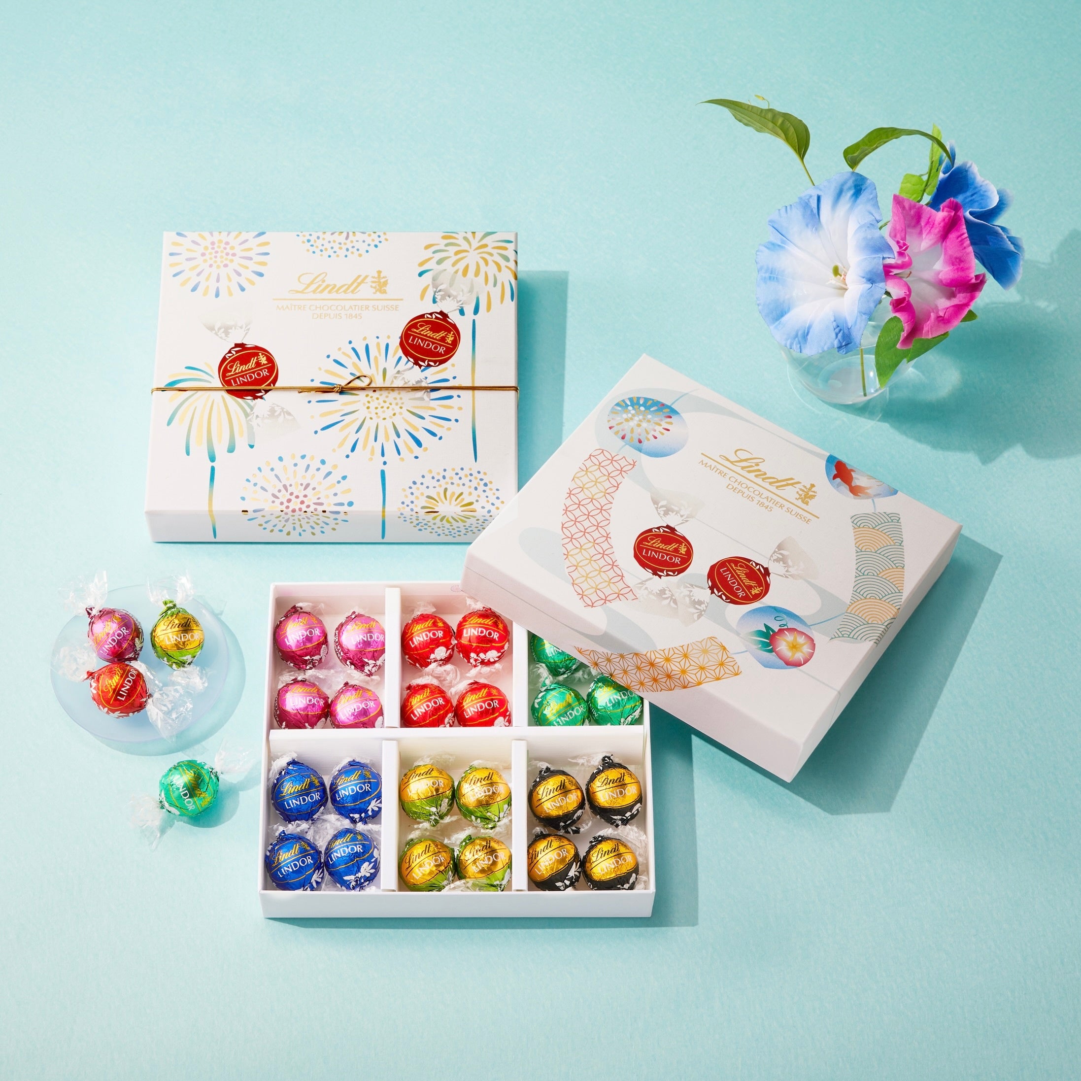 リンツの看板商品、くちどけなめらかなリンドールを詰め合わせたアソートボックス。定番の「ミルク」「ダーク」「70%カカオ」「抹茶」と期間限定フレーバー「ミント」「ラズベリー&クリーム」の計6種類を詰め合わせました。夏らしく涼やかな印象の風鈴と花火のデザインパッケージに入っており、日頃の感謝を込めて贈る夏のご挨拶やお中元にぴったりです。