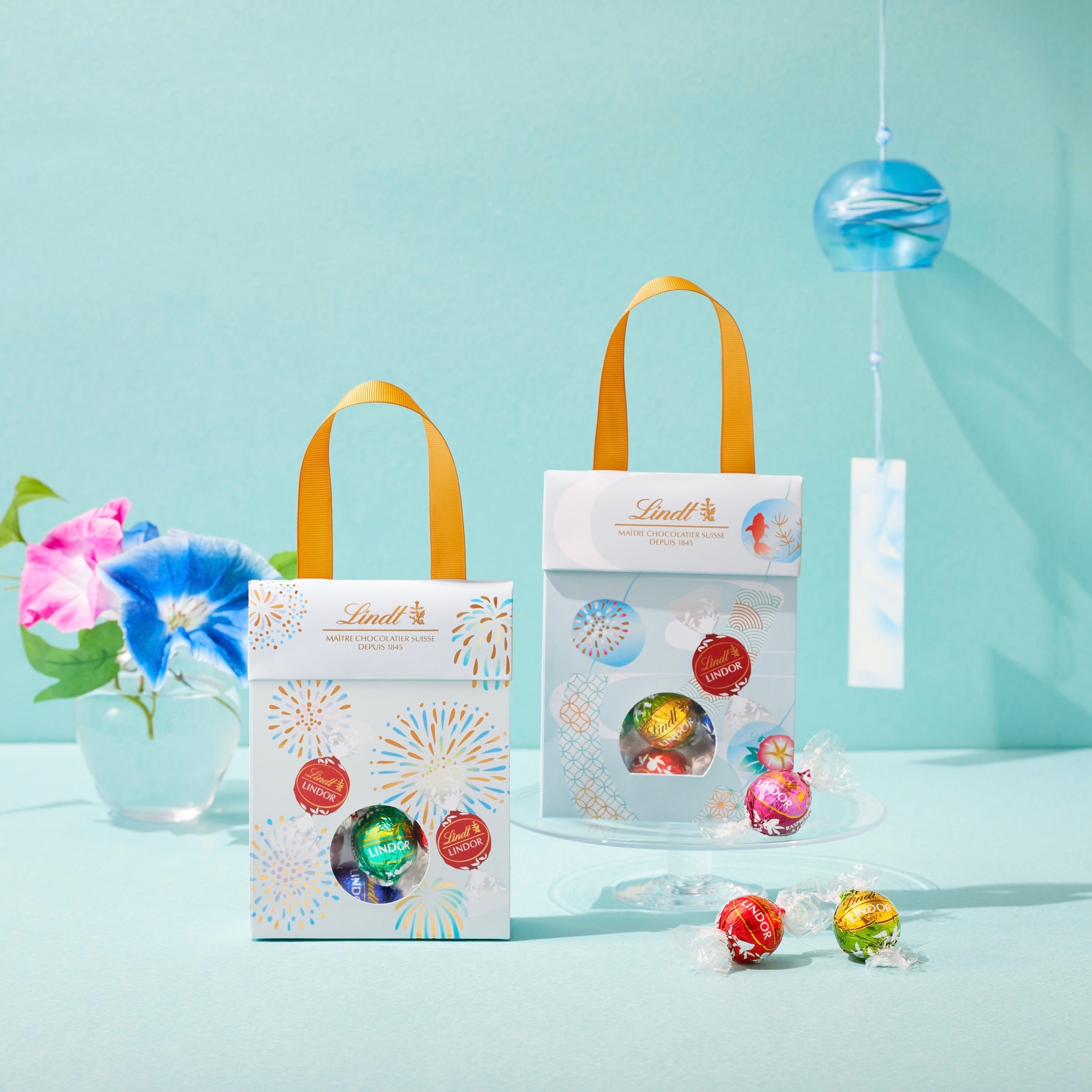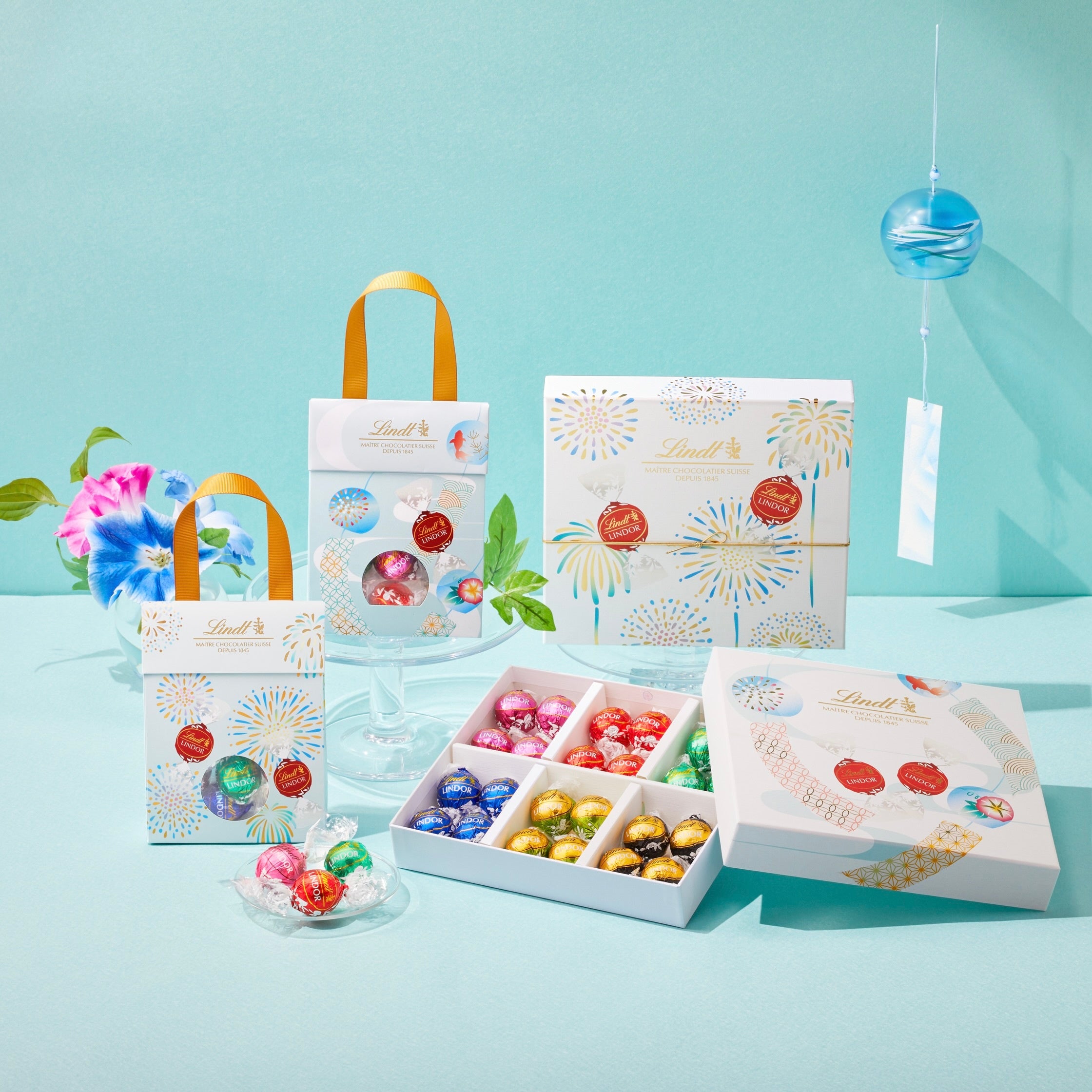 海外の友人への贈り物や、日本土産としてもおすすめのジャパンコレクションが、夏らしく涼やかな印象の風鈴と花火のデザインのパッケージで登場。「ミルク」「ダーク」「抹茶」と期間限定フレーバーの「ミント」「ラズベリー&クリーム」のリンドールが入った、見た目も可愛らしいこの夏だけのハンドル付きギフトバッグです。