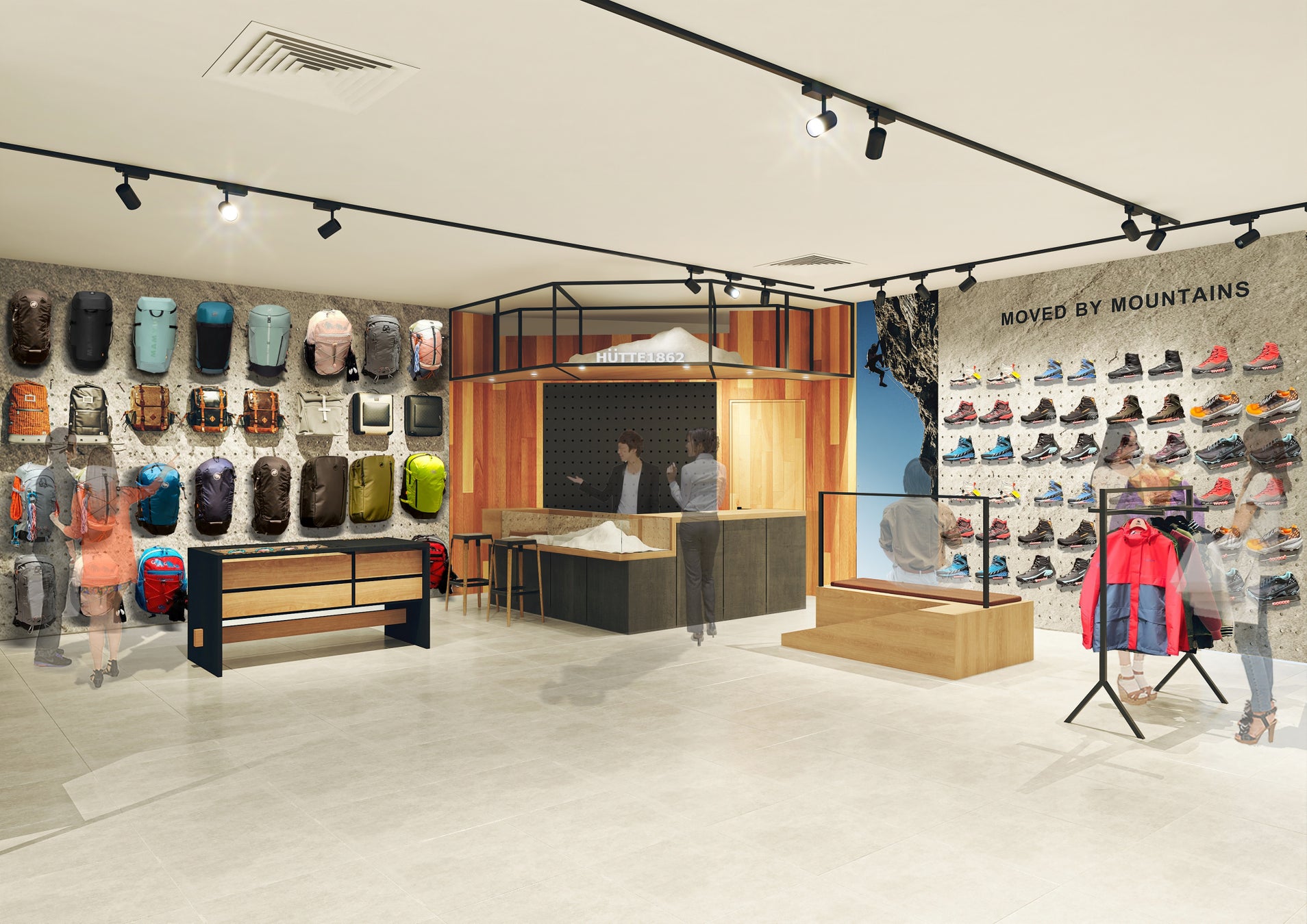 マムートストアのブランド体験スペース「ヒュッテ(Hutte)1862」では、京都のハイキング名所である愛宕山の造形を設置。マムートスタッフが愛宕山や京都周辺のハイキングや登山コースを説明します。「ヒュッテ」の天井は、マッターホルンの造形物となります。また、実際の登山に必要な道具をバックパックにパッキングできる体験やプロダクトケアの方法、マムートのCSRに関する情報などを提供いたします。ご来店いただいた方が買い物以外でも楽しめ、また広く京都の魅力を伝える店舗になっております。京都のハイキングルートの3D造形と、「ヒュッテ(Hutte)1862」の愛宕山の造形の公開を楽しみにしてください。