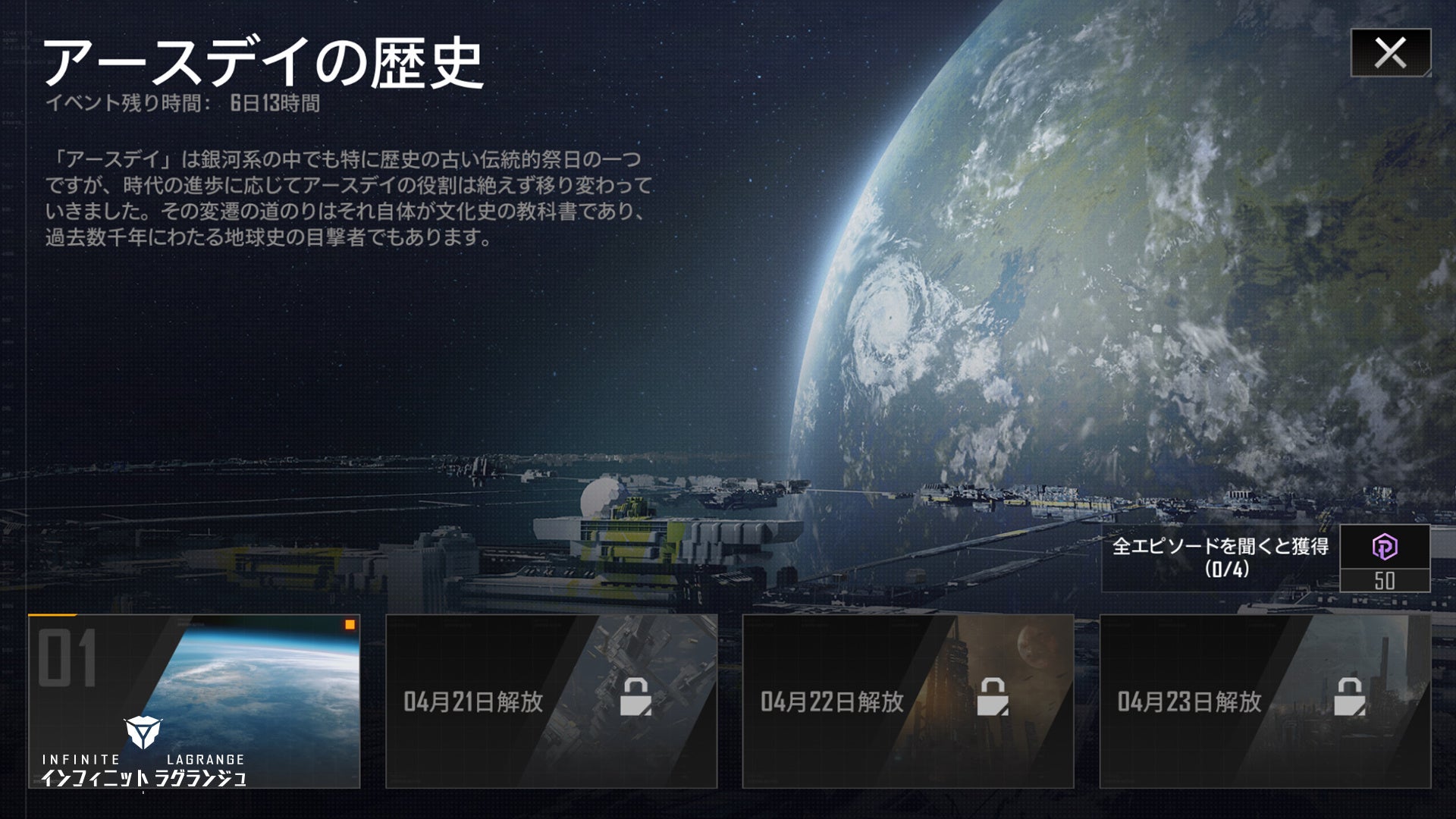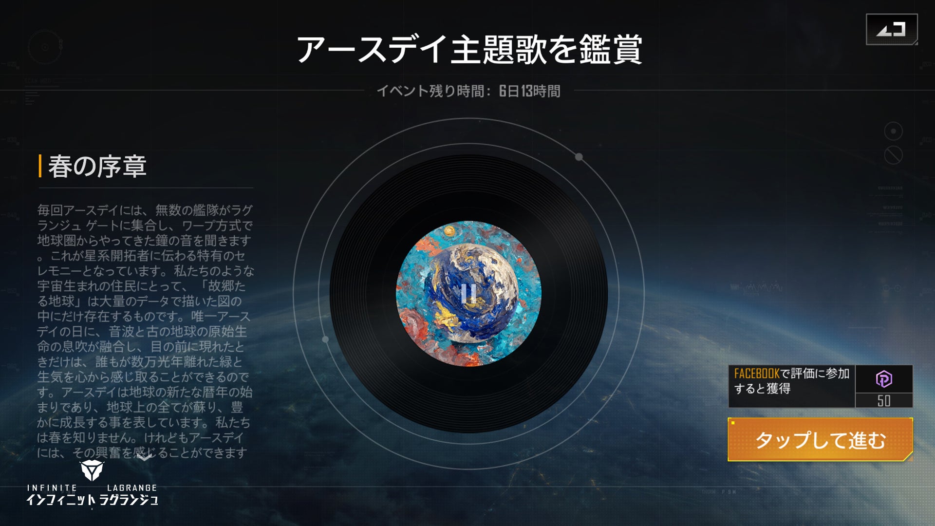 現実世界の『アースデイ』の到来を祝うべく、『インフィニット・ラグランジュ』にも特別なイベントを開催されることになりました。ラグランジュの歴史を振り返ってみますと、時代の変遷、技術発展を経て、地球は今も人々の故郷です。人類のよりかごを記念、讃え、追憶するために、地球圏の勢力が毎年定期的に「アースデイ」という盛大なフェスティバルを開催しており、地球文化を広め、銀河に対する古の地球の影響力を向上させ、惑星の歴史を記念し振り返っています。