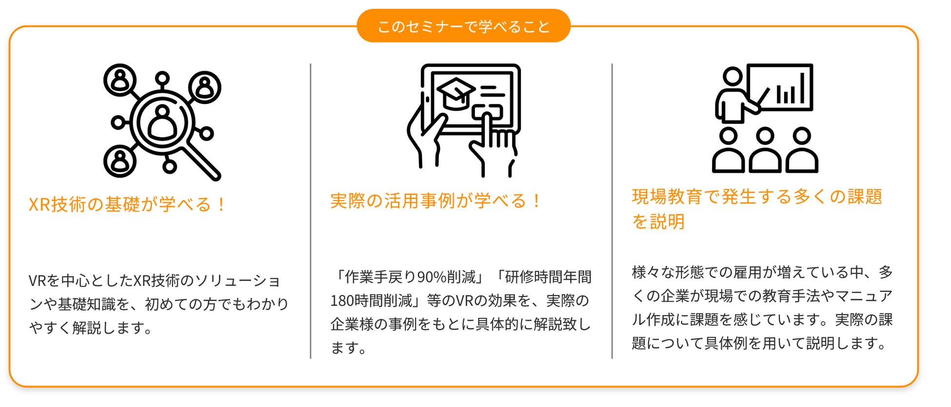 本セミナーではVRを中心とした最新技術を活用した教育手法について、はじめての方でもわかりやすく解説します。