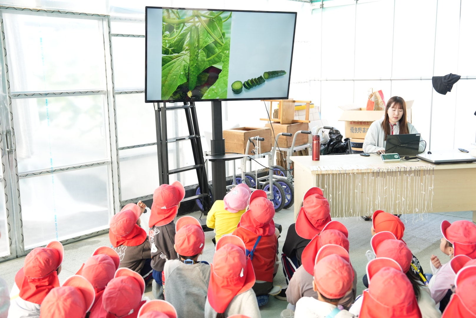 体験の冒頭、スタッフから「きゅうりの成長過程」や「収穫のコツ」、そして「最新の農場設備」についての事前説明を行いました。園児の皆さんは真剣な表情で耳を傾け、最先端の農業の姿に興味津々の様子でした。