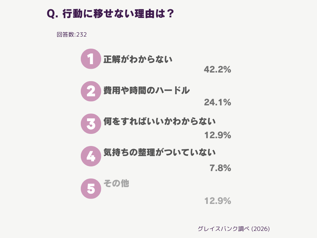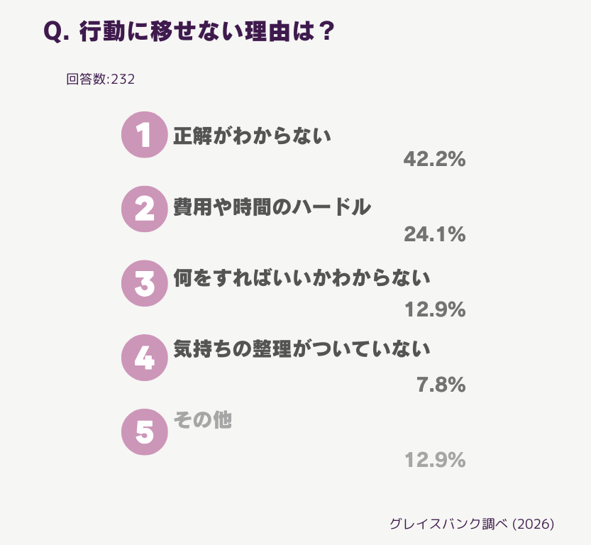 現段階では具体的な行動をしていない232名を対象に、行動しにくい理由・ハードルを聞いてみました。結果は以下の通り。