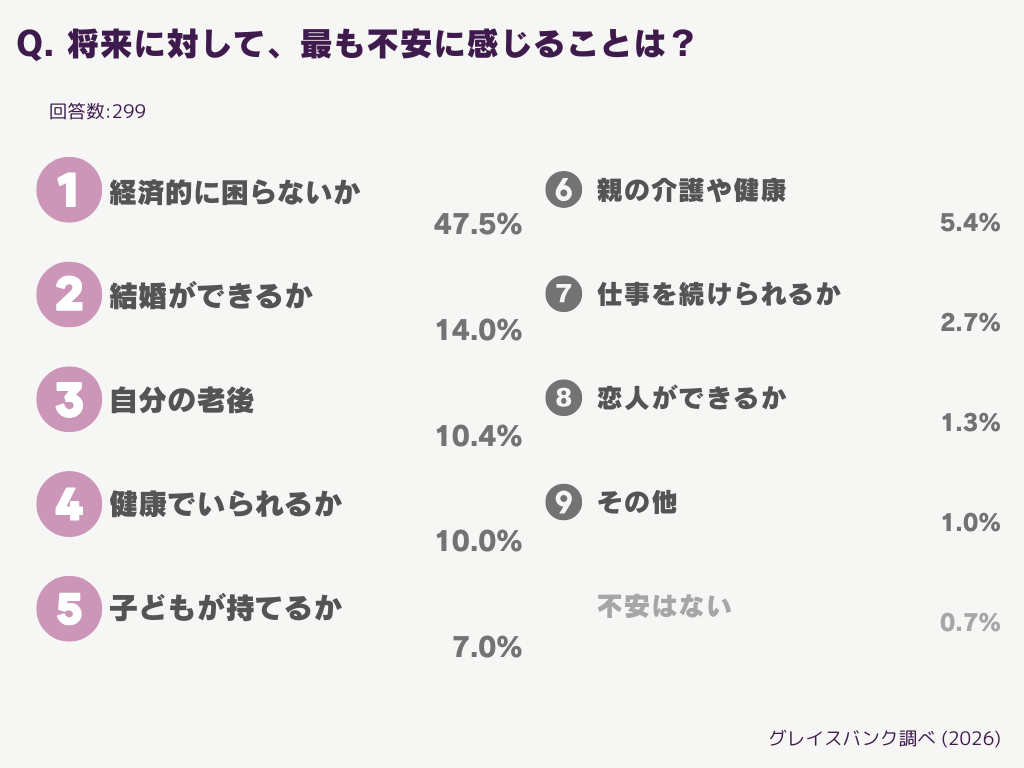 不安要素のうち、最も不安に感じていることを聞いてみると、半数近い47.5%のひとが「経済的に困らないか」と回答しました。以下、「結婚ができるか(14.0%)」「老後に健康でいられるか(10.4%)」「子どもを持てるか(7.0%)」と続いています。