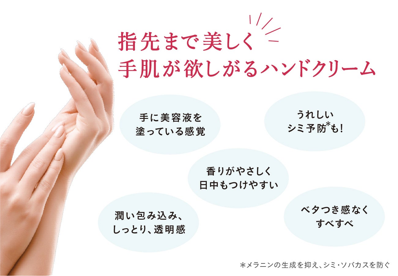 体の部位の中でも最も動作が大きく、ときにその人らしく豊かに感情を表現する手。人から見られ、自分でもよく見る指先だからこそ、手洗い、消毒した後に、丁寧なケアがおすすめです。メラニンの生成を抑え、シミ・ソバカスを防ぐとともに潤いで包み込み、透明感のある手肌に導くハンドクリームです。通常デザイン品では「何本もリピートしていて、手放せません!」との声もいただいており、発売から愛され続けている商品です。