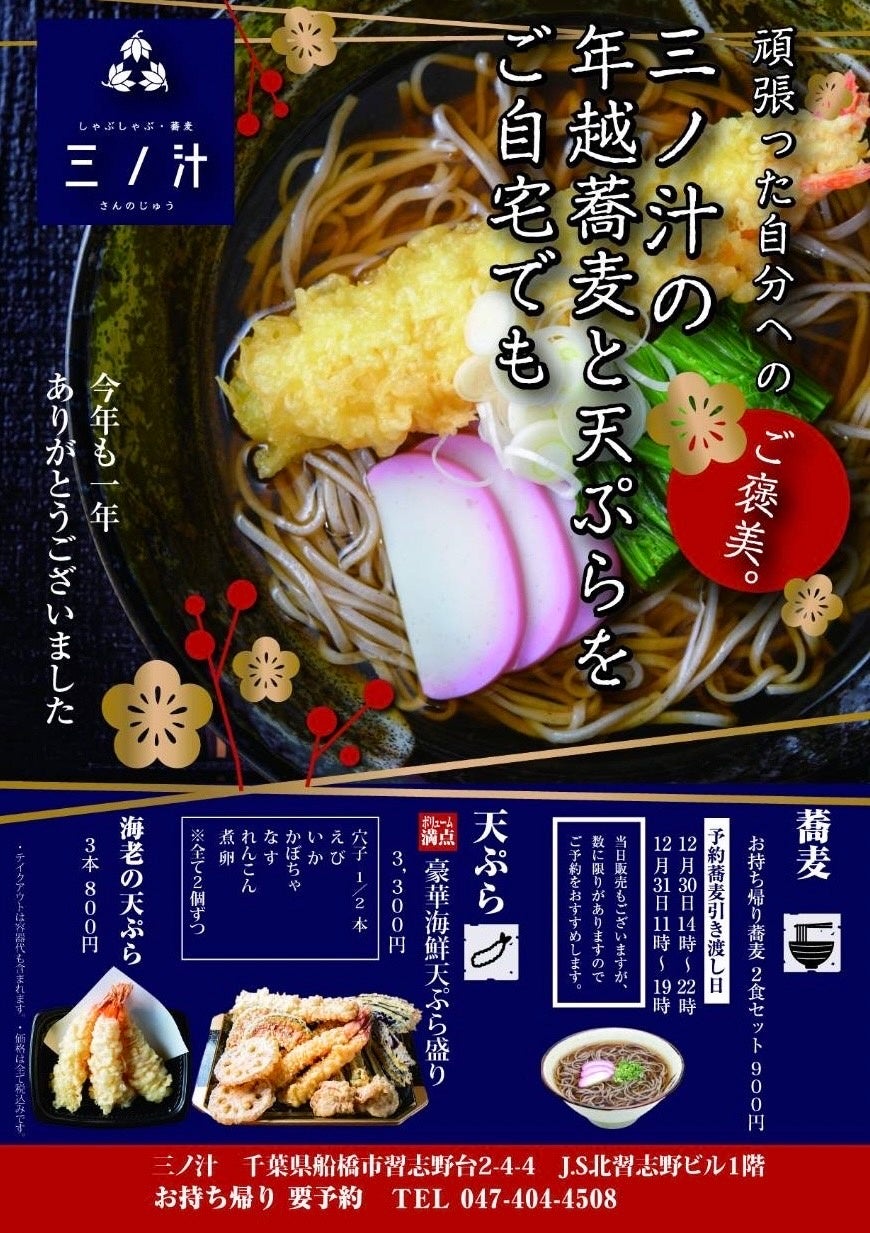 北習志野のお食事処 三の汁(さんのじゅう)にて毎年地元のお客様に大人気の「年越しそば」のお持ち帰り販売のご予約を開始しております!
