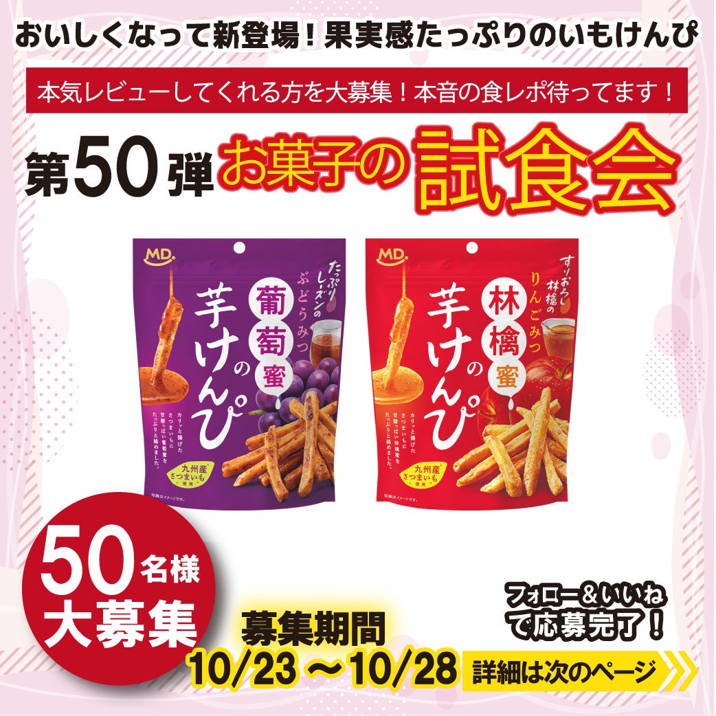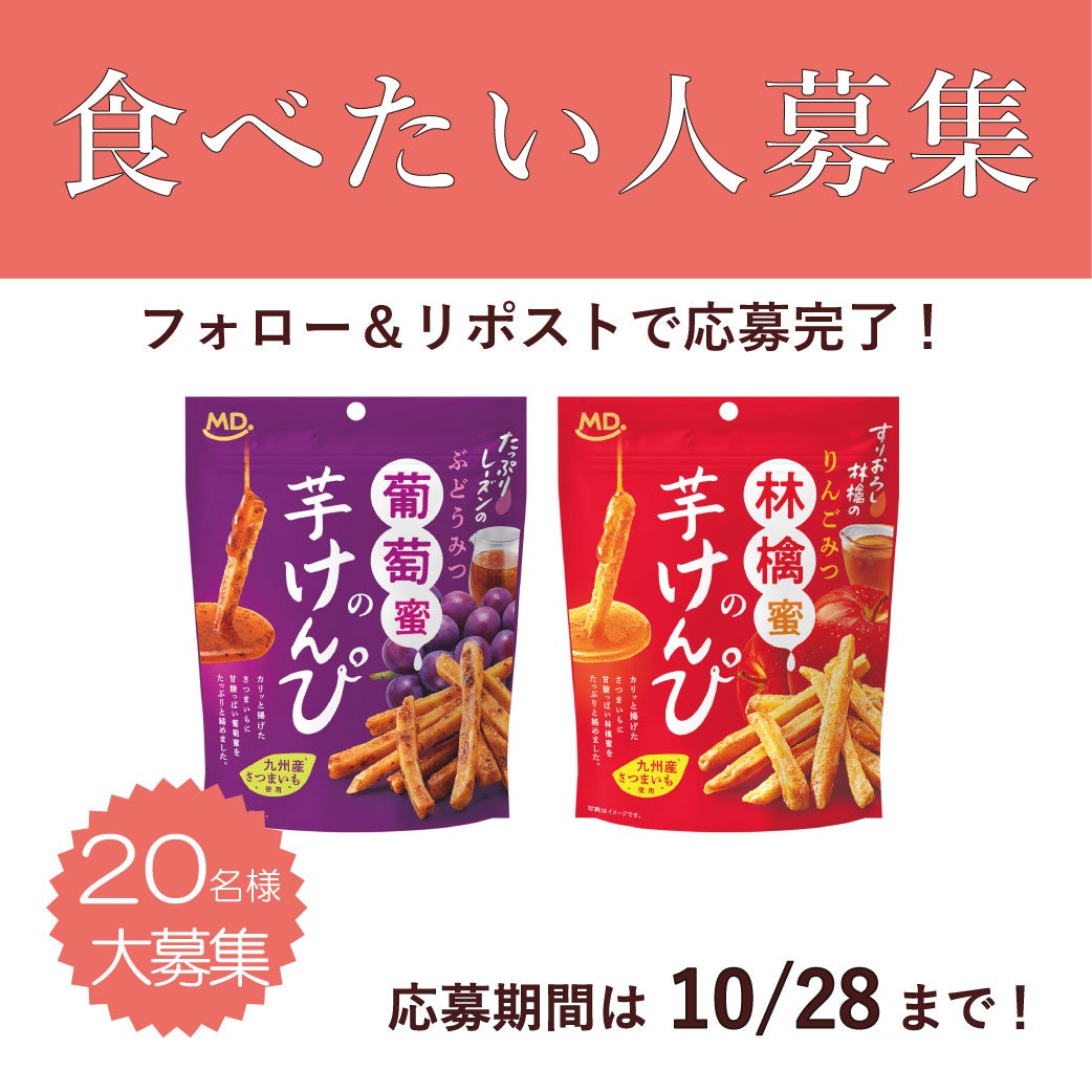 このたび、新商品の発売を記念し、MDホールディングスの公式Instagramアカウント(@mdhdg2215)と公式Xアカウント( @mdhdg2215 )にて、「お菓子の試食会」(プレゼントキャンペーン)を実施いたします。下記方法によりご応募頂いた方の中から、本商品『葡萄蜜の芋けんぴ』『林檎蜜の芋けんぴ』のセットを、抽選で合計70名様にプレゼントいたします。秋の味覚を詰め込んだお菓子を、ぜひお試しください。