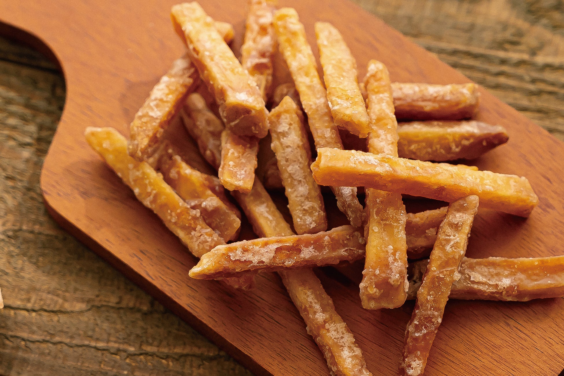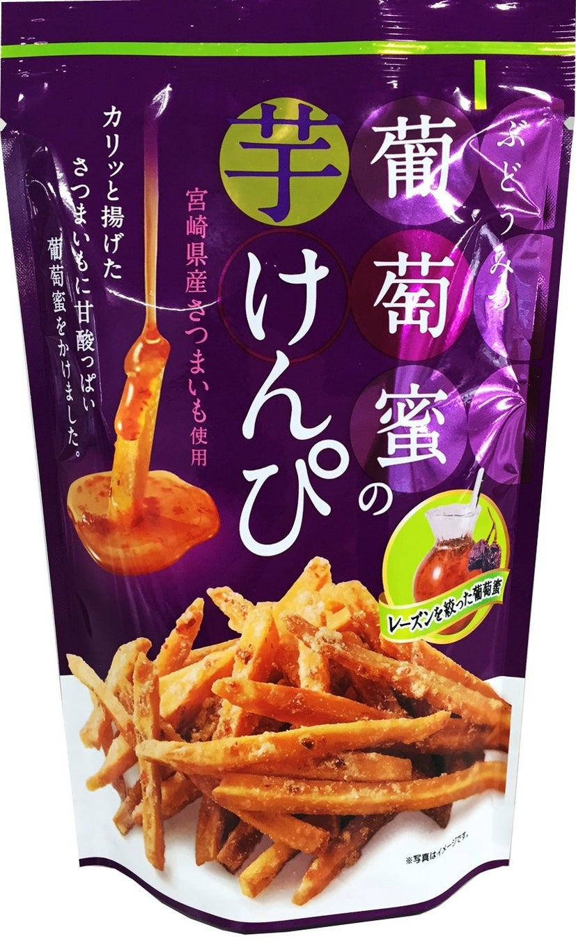 特長:カリッと揚げたさつまいもに甘酸っぱい葡萄蜜を絡めた、香り高い贅沢な芋けんぴです。