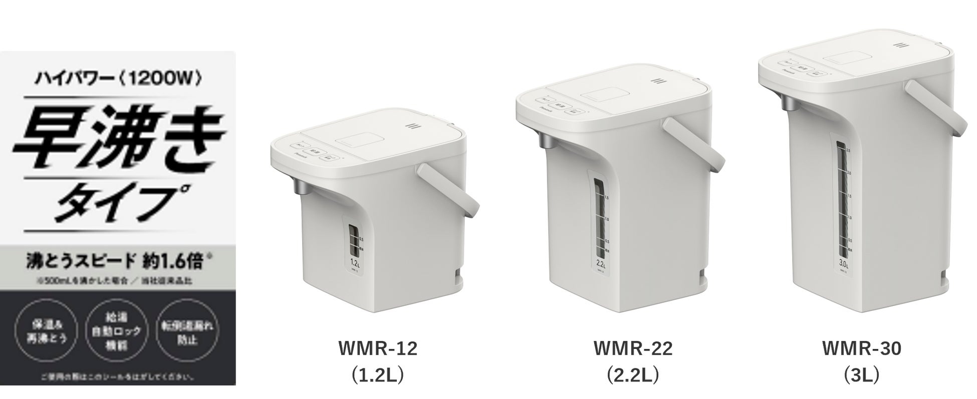 今回の「電気ポット 早沸きタイプ(WMR-12/22/30)」は、1200Wのハイパワーにより従来品(WMJ型)の約1.6倍の早沸きスピードを実現。水が沸騰するまでの待ち時間のストレスを軽減し、使いたい時にサッとお湯が使える便利で快適な電気ポットとなりました。