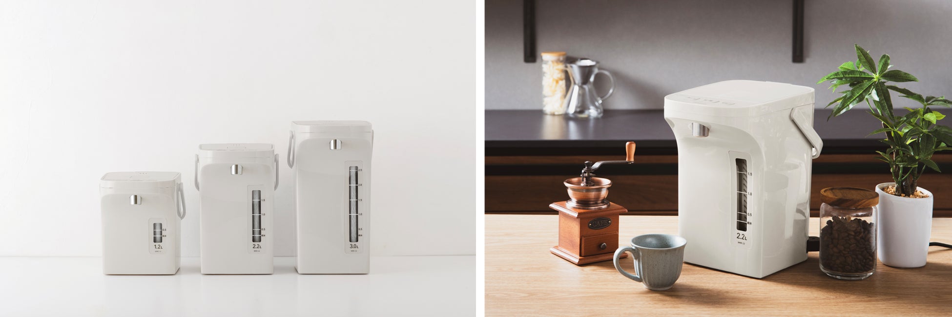 また、ライフスタイルに合わせて選べる3サイズ(1.2L・2.2L・3.0L)展開で、1.2Lの小容量サイズは、単身世帯やコンパクトなキッチンにもぴったりです。刷新したデザインは、シンプルでスタイリッシュなフォルムと使いやすい操作性を兼ね備え、毎日のお手入れも簡単です。