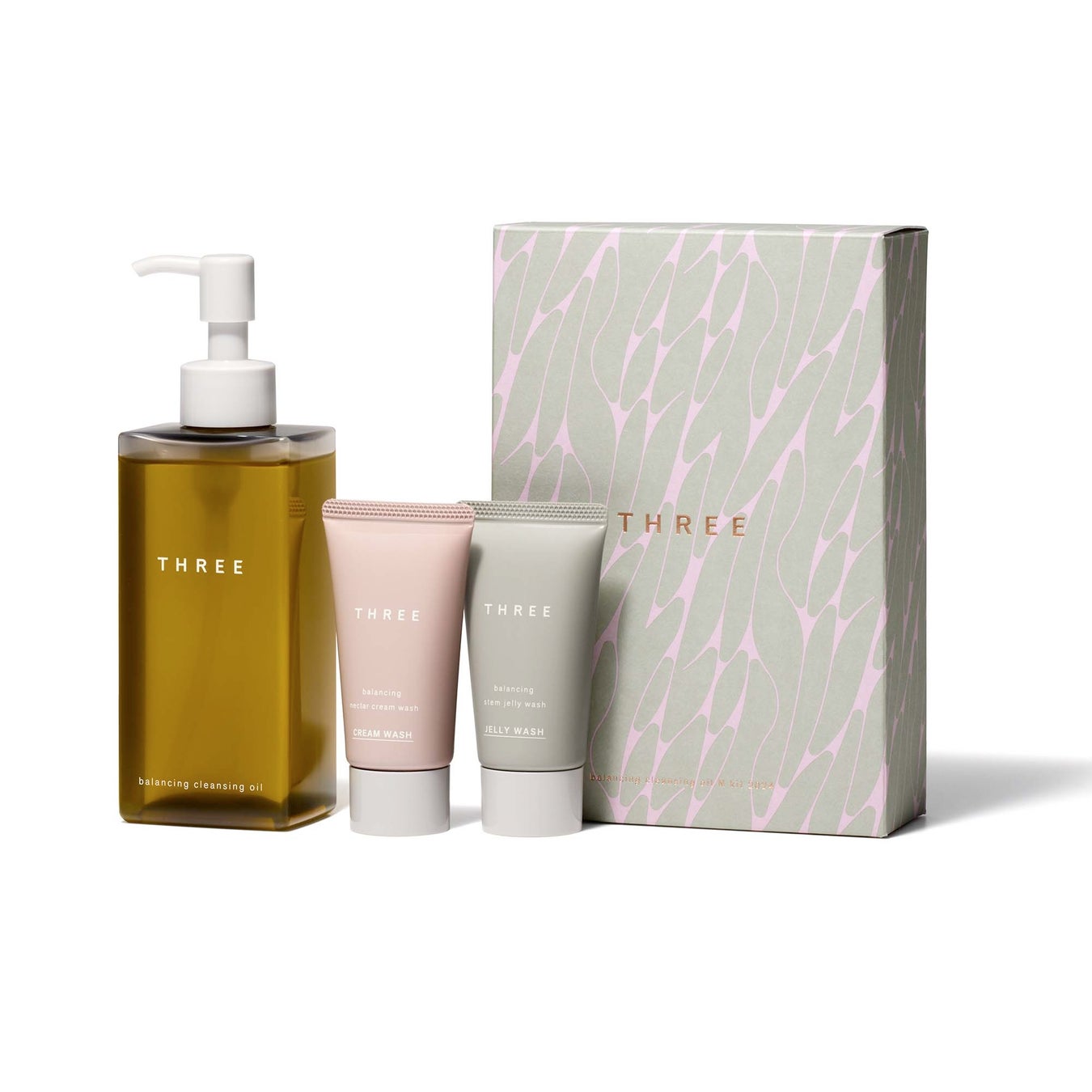うるおいで満たしながら洗い上げるクレンジングオイルに加え、濃密な泡が摩擦レスで肌の汚れをオフするクリームウォッシュと、植物性のマイルドなスクラブを配合したジェリーウォッシュの全3品をセットしたクレンジングキット。今シーズンだけの特別ボックスとともにお届けします。