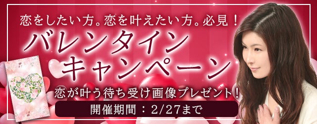 『バレンタインキャンペーン』では恋の季節に相応しい恋愛鑑定をご用意いたしました。本キャンペーンでは、通常は購入しないと見る事が出来ない鑑定を特別に一部無料公開!さらに対象の鑑定をご購入の方全員に「恋が叶う」待ち受け画像をプレゼントいたします!恋をしたい方、叶えたい恋がある方。この機会に是非占ってみてはいかがでしょうか。