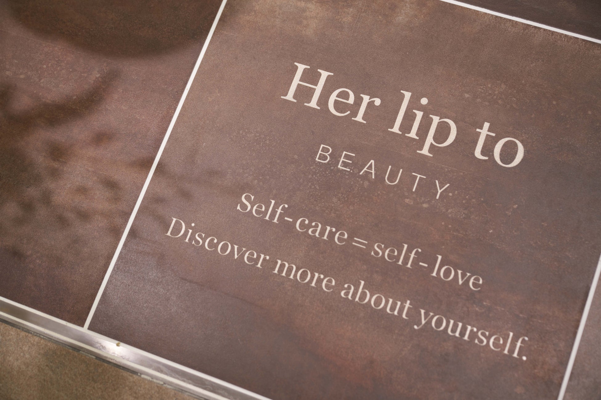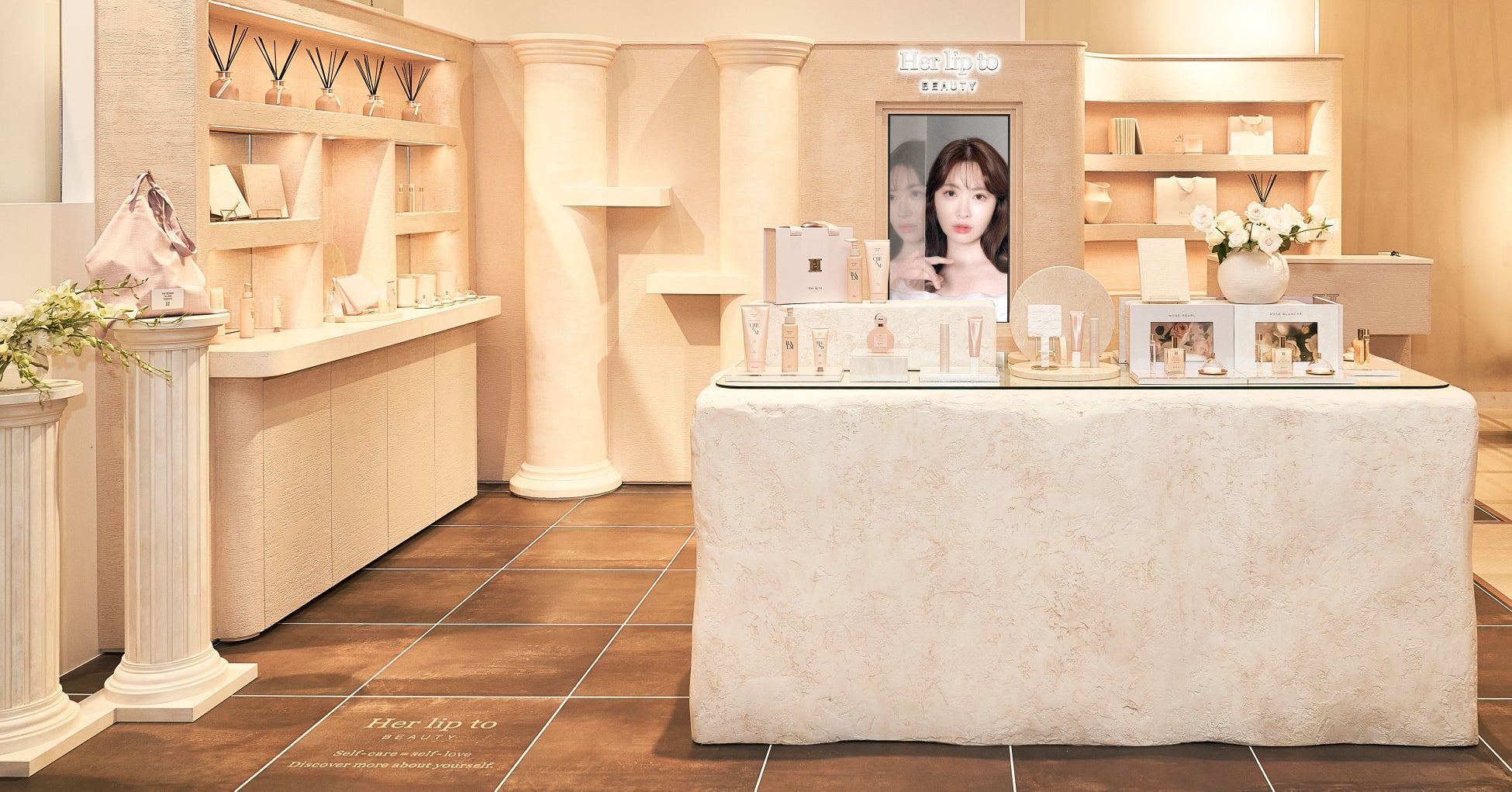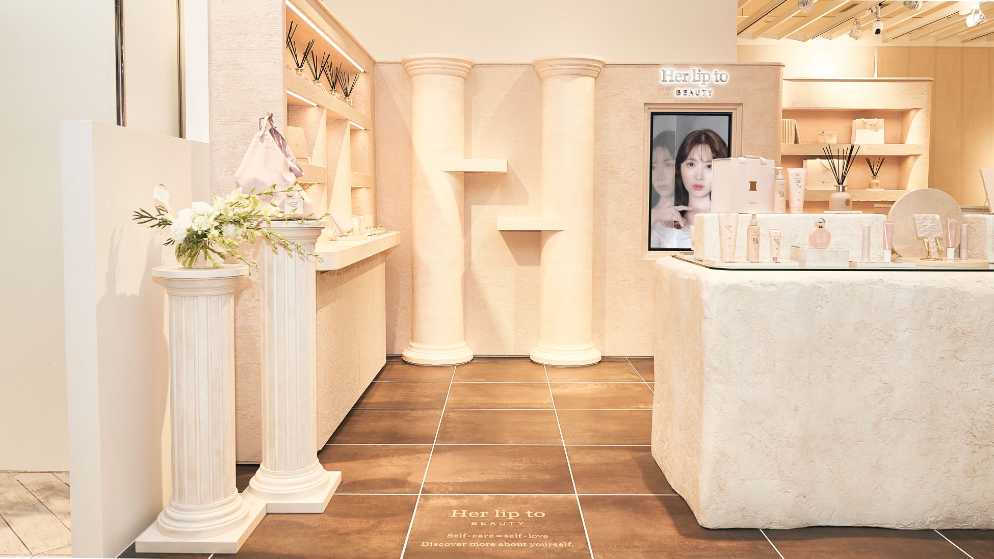 18世紀フランスの「Salon(サロン)」をテーマとした店内は、エクリュベージュを基調とし、Her lip to BEAUTYのシンボルである“H”を模った意匠柱がファサードを飾ります。足元にはHer lip to BEAUTYのコンセプトであるSelf Care=Self Loveのメッセージを刻むことで、足を踏み入れた瞬間からブランドの世界観を感じ、自分自身にもときめきを感じる、特別な空間に。