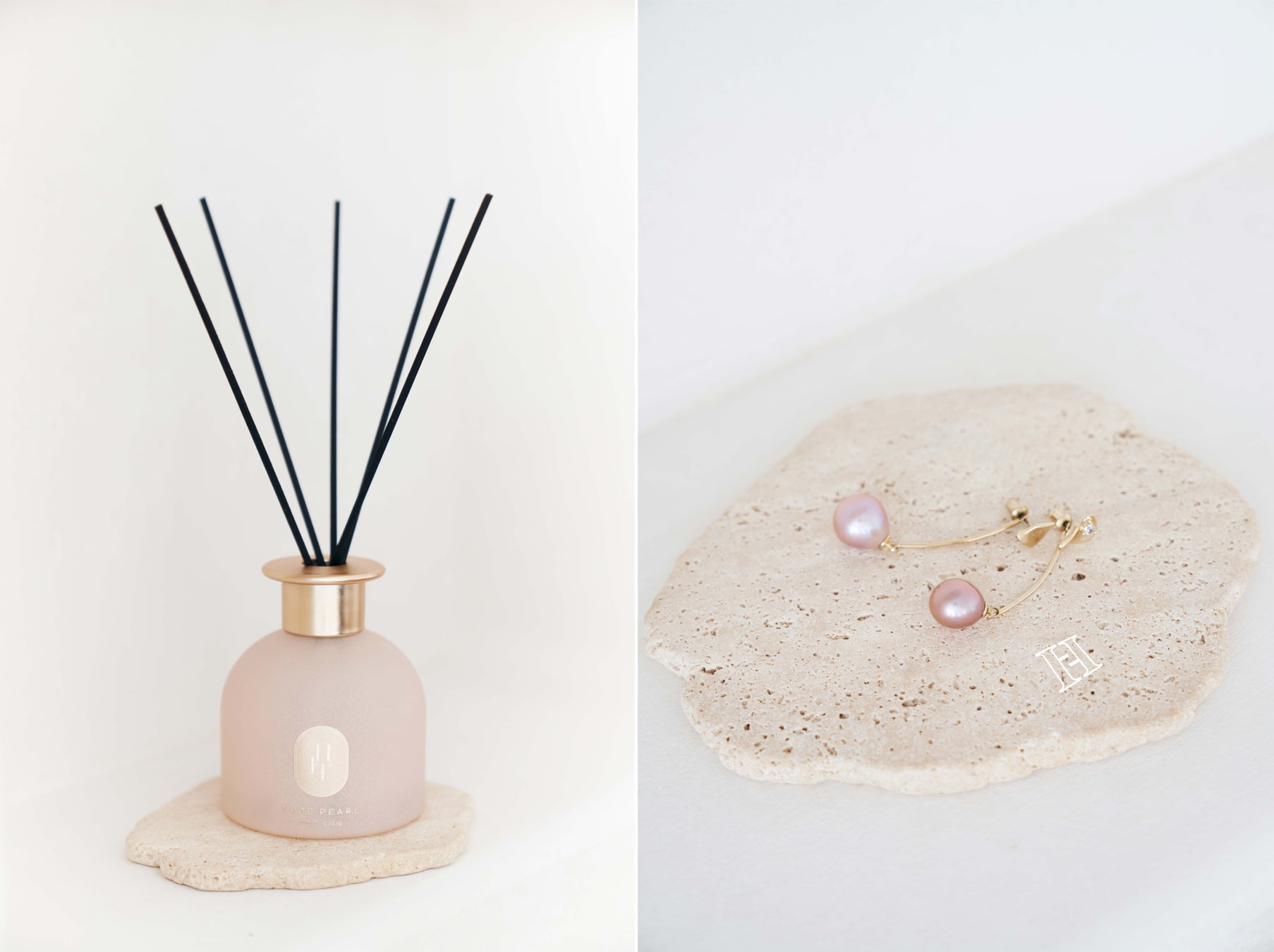 今回のために作られたオリジナルストーントレイとお好きな香りが選べるディフューザーの限定セット。トラバーチンを使用したストーントレイには、Hのロゴが施され、セットアイテムのディフューザーの他、お気に入りの香水やジュエリーなどをディスプレイしてご使用いただくこともおすすめです。
