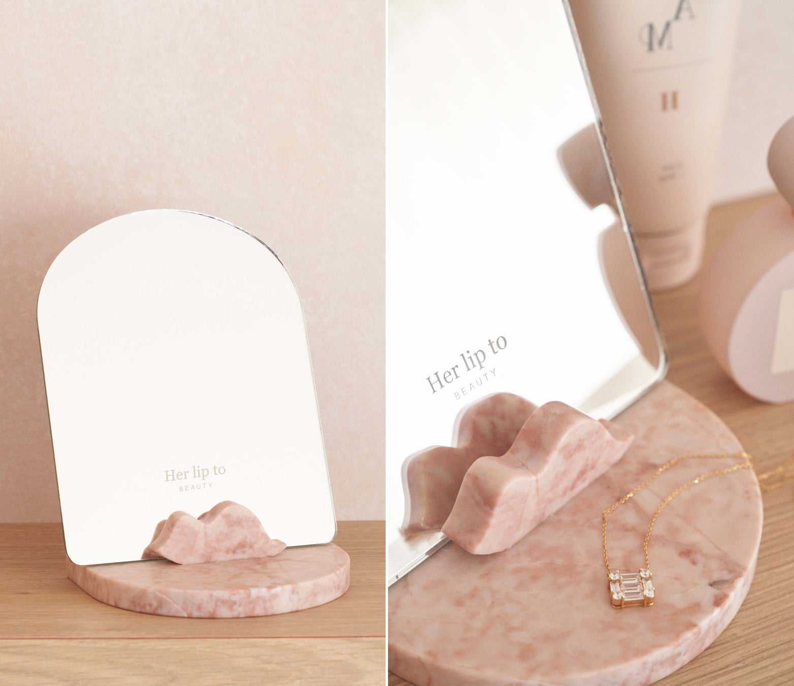 ローズミルクのリップモチーフがポイントの卓上ミラー。アーチを描いたミラーにはHer lip to BEAUTYのロゴが施され、大切なジュエリーを置いたり毎日覗く場所だからこそ気分が上がるデザインに。お部屋に置いてインテリアとしてもお楽しみいただけます。
