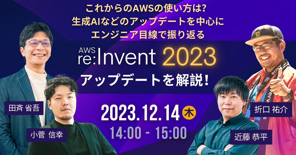 14:00 - 14:55 | 【 AWS re:Invent 2023リキャップ 】 これからの AWS の使い方は?生成AIなどのアップデートを中心にテック目線で振り返る 【登壇者】 エンタープライズクラウド部 クラウドコンサルティング課 課長 |