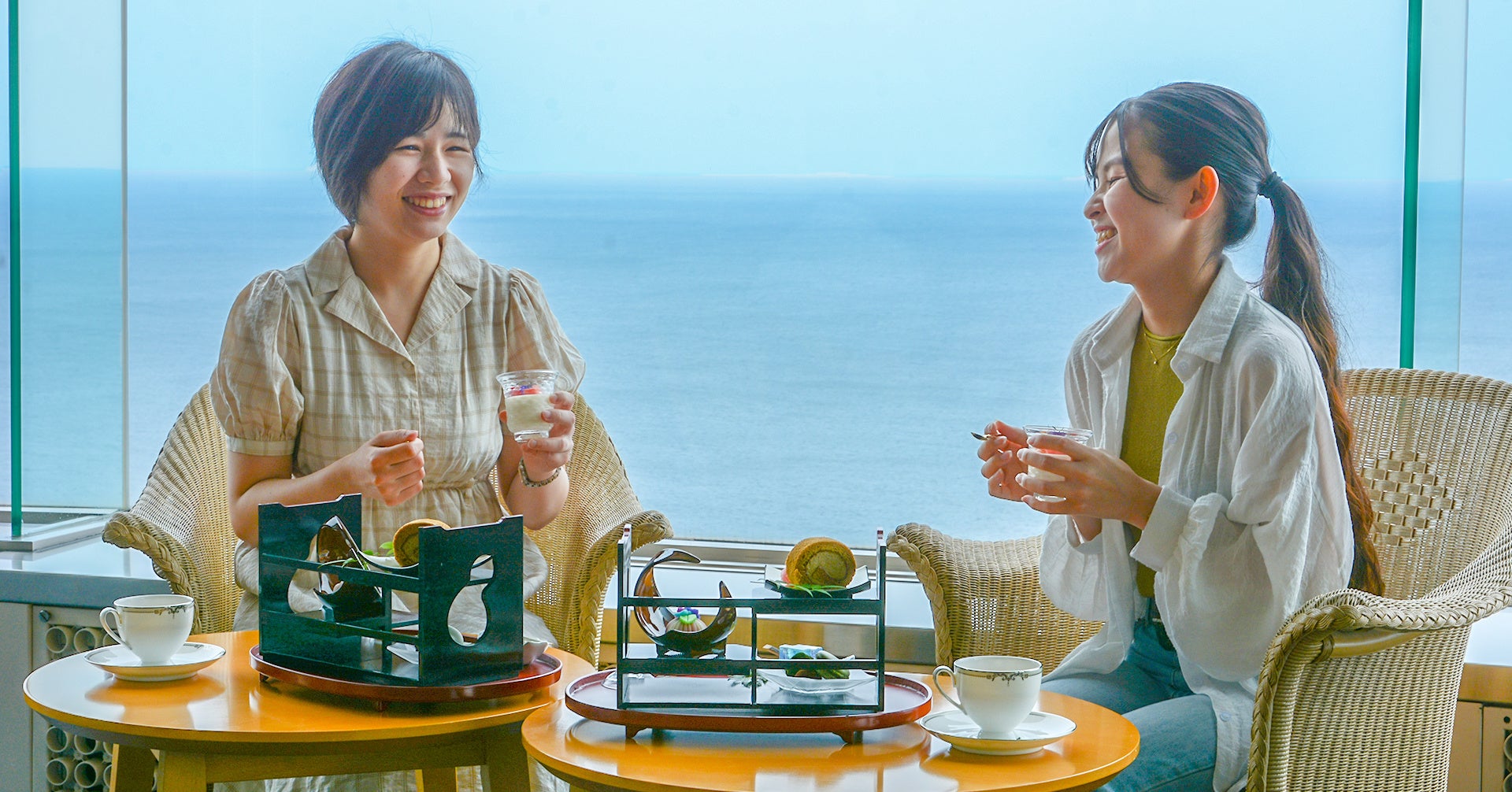 お風呂あがりには、相模灘を一望するロイヤルラウンジで涼みながら、まろやかな紅ふうき茶と、和菓子職人が一つひとつ手作りする、出来たての和菓子のアソートをお楽しみください。5種類の繊細な和菓子は、3段重ねにアレンジされており、味はもちろん見た目にも華やかです。絶好のロケーションのもと、日帰り旅行の最後を締めくくります。当社は、海外リゾート地さながらのリラクゼーションと、日本ならではのおもてなしの心をもって、熱海にしかない非日常体験の提供を目指します。