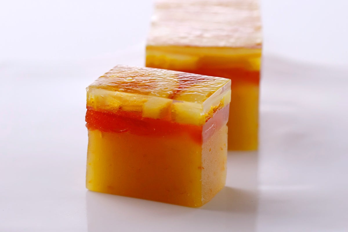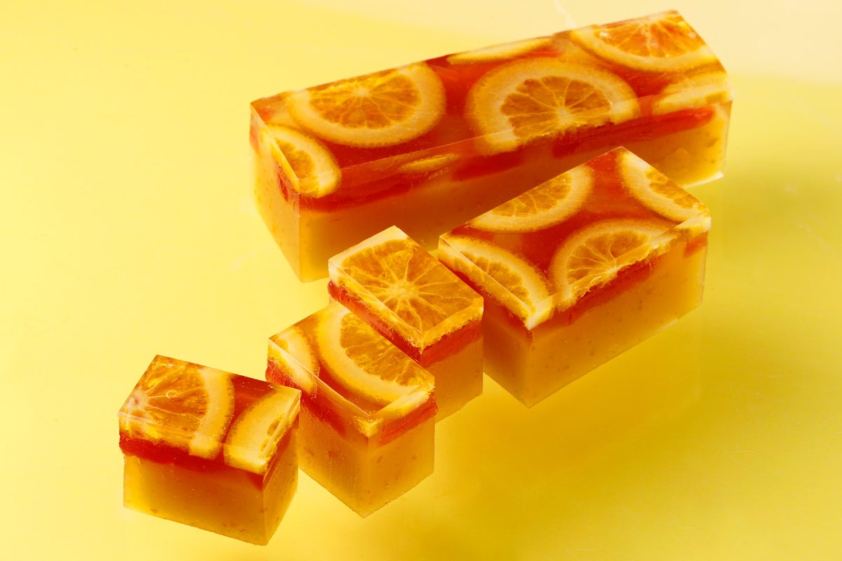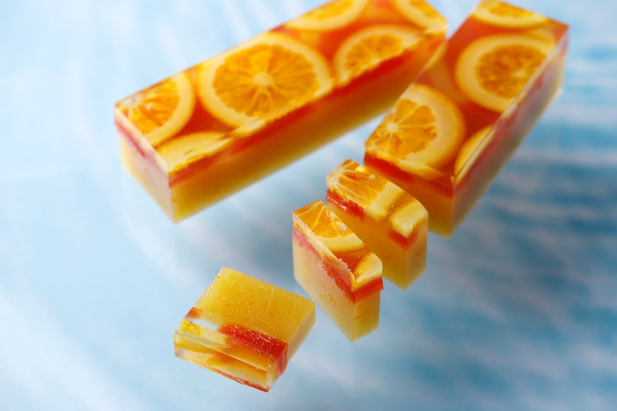 涼しげな錦玉にとじ込めたオレンジの輪切りが華やかな橙々羹。アールグレイティのフレーバーである、ベルガモットの香り広がる錦玉の中には、パティシエが本場フランスで感銘を受けてレシピを開発した、濃厚で力強いブラッドオレンジを使用したパート・ド・フリュイを敷き詰めています。3日間、休ませながらじっくり炊き上げたオレンジの羊羹は、角がとれた柑橘の美味しさと、しっとりなめらかな食感をお楽しみいただけます。