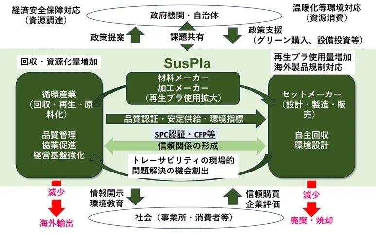 SusPlaでは、SPC認証の拡大、動静脈双方が集う対話の場の形成、環境影響指標の策定検討等の活動を通して、2030年国内でのマテリアルリサイクルによる再生プラスチック利用倍増への寄与を目指します。