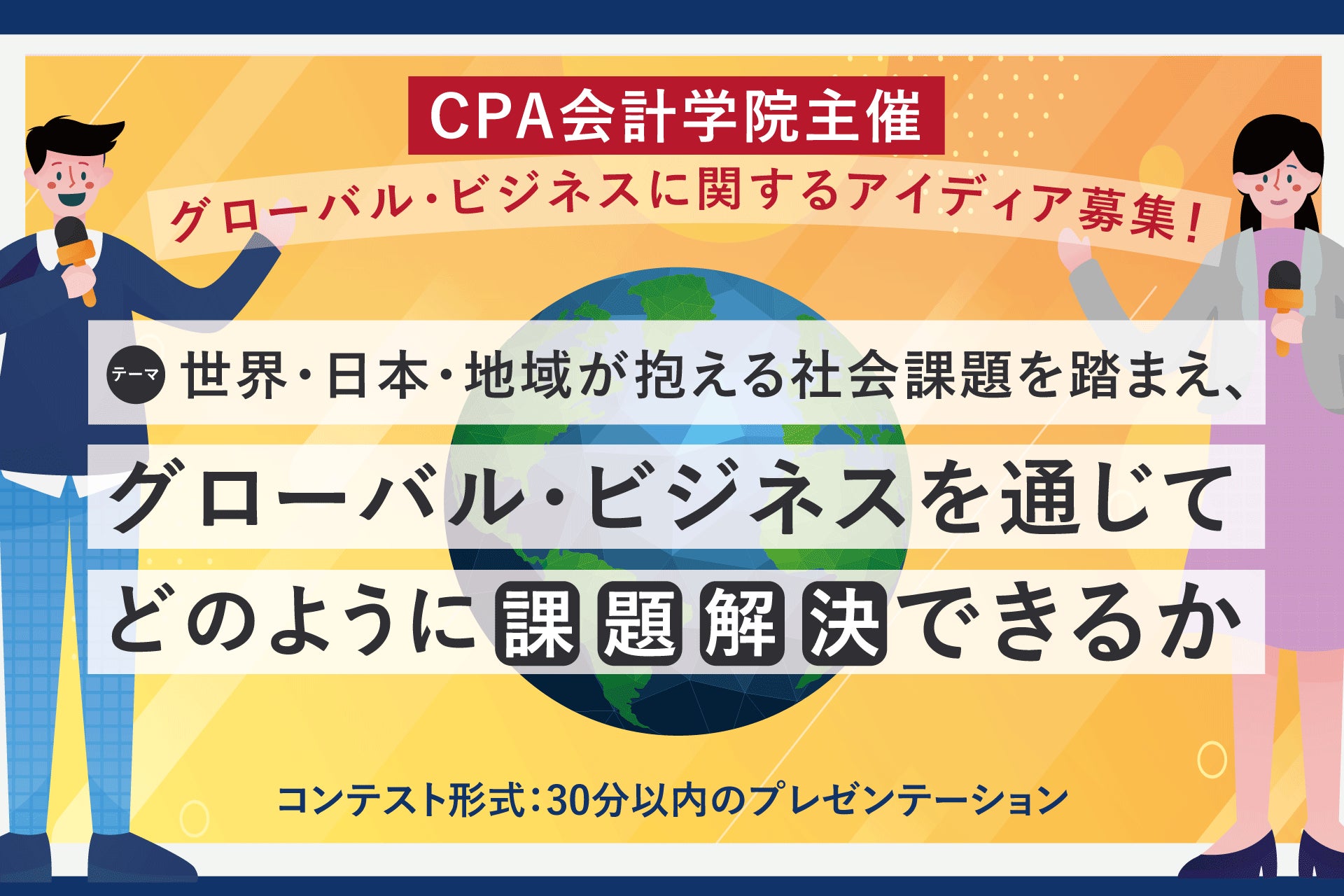 CPAエクセレントパートナーズ株式会社が運営する公認会計士資格スクール「CPA会計学院」により、「トビタテ!留学JAPAN」に採択された高校生/大学生(大学院含)を対象に、「グローバルビジネスを通じてどのように課題解決できるか」というテーマで30分以内のプレゼンテーションを行うコンテストが開催されます。優秀賞として計6名(高校生3名、大学生3名)にCPA会計学院が提供するU.S.CPA(米国公認会計士)講座の受講料が全額免除されます。